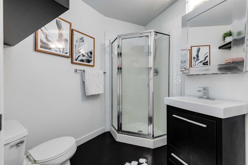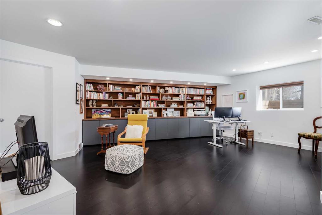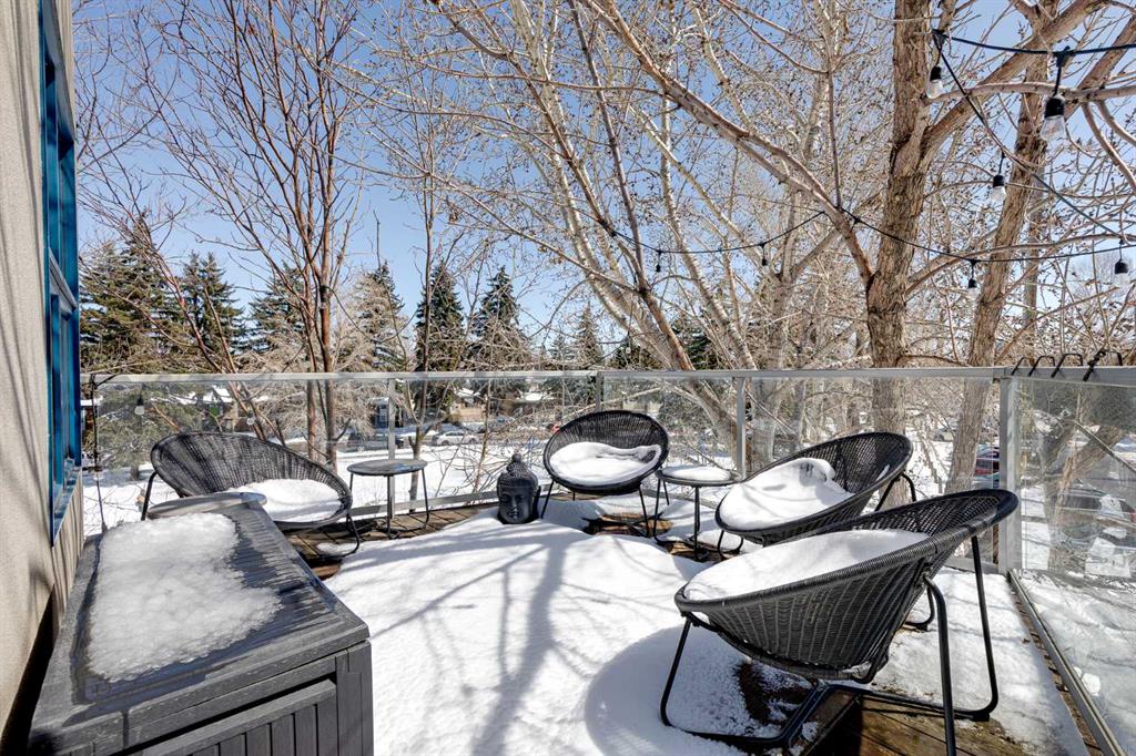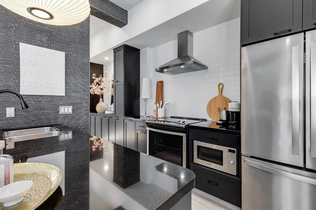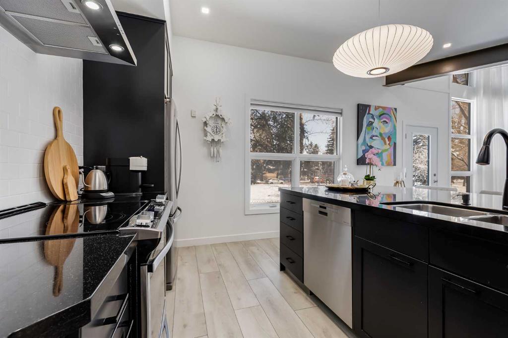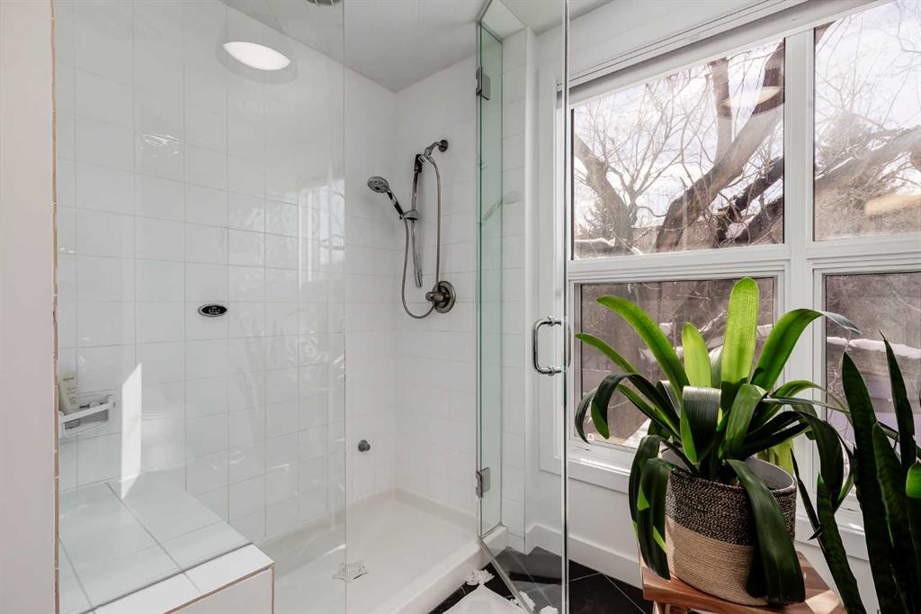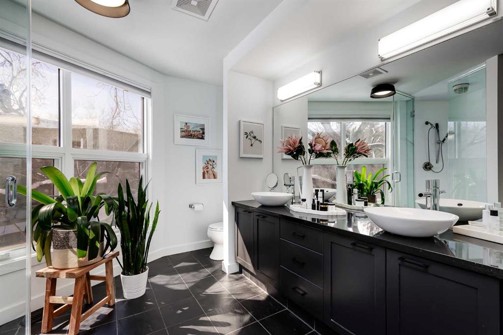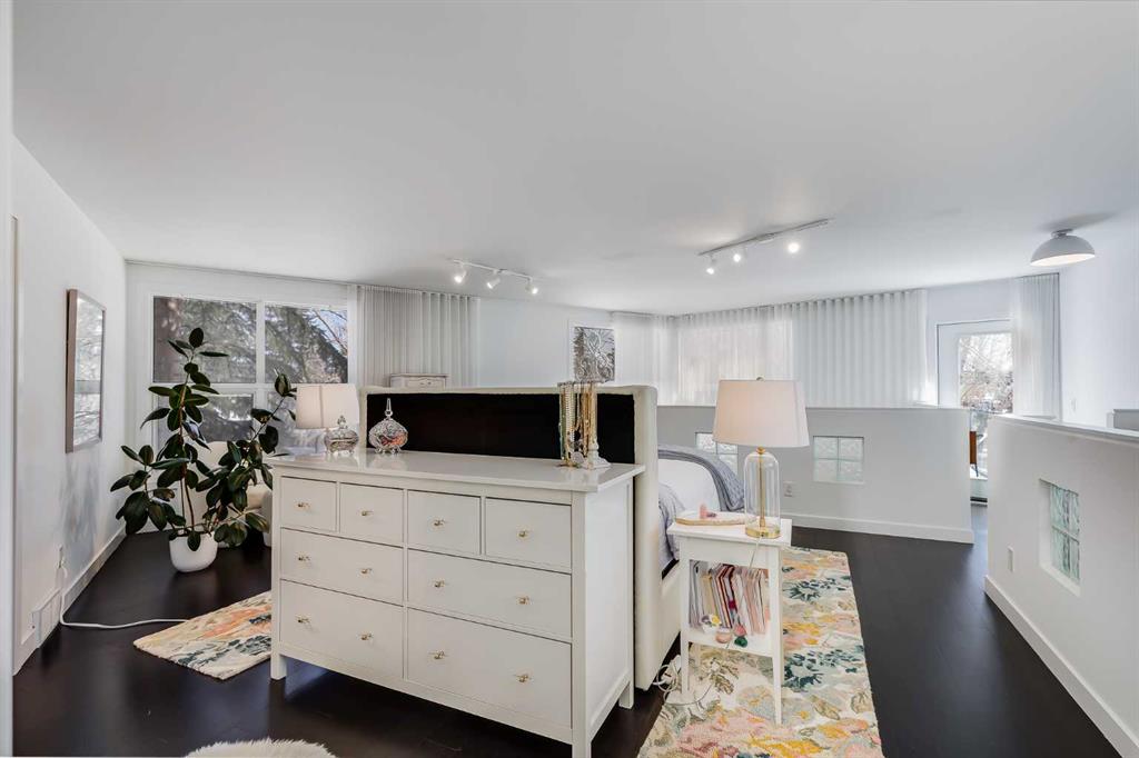 This distinctive end-unit townhouse in the sought-after community of Inglewood offers a rare opportunity for those seeking a flexible live/work environment, with the ability to operate a business subject to board approval, or simply enjoy a unique place to call home. With over 2,100 square feet of developed living space, this is the largest residence within an exclusive 12-unit complex, tucked along a quiet, tree-lined street just steps from the neighborhood’s well-known shops, restaurants, and amenities. The exterior presents a modern blend of stucco and corrugated metal siding, complemented by oversized, energy-efficient reflective windows. Inside, over $80,000 in renovations enhance both form and function. The main floor opens with a generous entryway and continues into an open-concept layout grounded by wide-plank vinyl flooring. Soaring 18-foot ceilings, expansive windows, and full-height drapery bring in natural light and add dimension, while subtle industrial elements, including exposed steel features, contribute to the home’s architectural character. The kitchen is both practical and refined, featuring black cabinetry, granite countertops, a stylish backsplash, stainless steel appliances, and a large island with seating. Adjacent dining and living areas provide a comfortable setting for everyday living or hosting, with designer lighting over the dining space and a gas fireplace anchoring the living room. Full-height windows frame views of the surrounding greenspace and park, creating a strong connection to the outdoors. A two-piece powder room completes this level. Upstairs, the entire loft is dedicated to the primary retreat, offering a private and spacious layout with cork flooring underfoot, a large walk-in closet, and a five-piece ensuite with dual sinks, a deep soaker tub, and an oversized glass-enclosed shower with bench seating. The upper balcony extends the living space outdoors, with ample room for seating and elevated views through the surrounding trees. The fully developed basement adds further flexibility with a spacious recreation area suited for a media room, office, or fitness space. A full wall of built-in shelving provides both storage and display, while additional pot lighting ensures the space is well-lit into the evening. A spacious den and a three-piece bathroom offer privacy for guests or extended use, along with additional storage. Outside, the property backs directly onto greenspace and a park, creating a natural extension of the home’s living space. A private yard offers room for a BBQ and easy access to outdoor areas. Park conveniently in any of the ample stalls at your front door or in a titled stall within the heated garage. Located in one of Calgary’s most established inner-city neighborhoods, this home is within walking distance to boutique shopping, dining, cafés, and local breweries. The Bow River pathways are just minutes away, and you’ll enjoy quick access to downtown by car or public transit. Check out the 3D Tour!