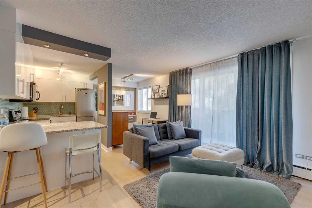 Welcome to The Modella, a charming boutique building tucked away on a quiet, tree-lined street in the heart of Lower Mount Royal, one of Calgary’s most desirable inner-city communities. This beautifully appointed former show suite offers 557 sq. ft. of thoughtfully designed living space, perfect for first-time buyers, young professionals, or investors seeking a stylish, turnkey property in an unbeatable location. From the moment you step inside, you’ll appreciate the bright, open-concept layout and the warm, modern finishes throughout. The upgraded wide-plank hardwood flooring, sleek white cabinetry, granite countertops, and elegant glass-tile backsplash create a clean, contemporary kitchen that feels both functional and inviting. The living and dining area flows seamlessly and opens onto a private balcony, ideal for morning coffee, evening relaxation, or summer barbecues. Even better, the Samsung TV package and custom-built-in wall unit are included, making this a true move-in-ready opportunity.