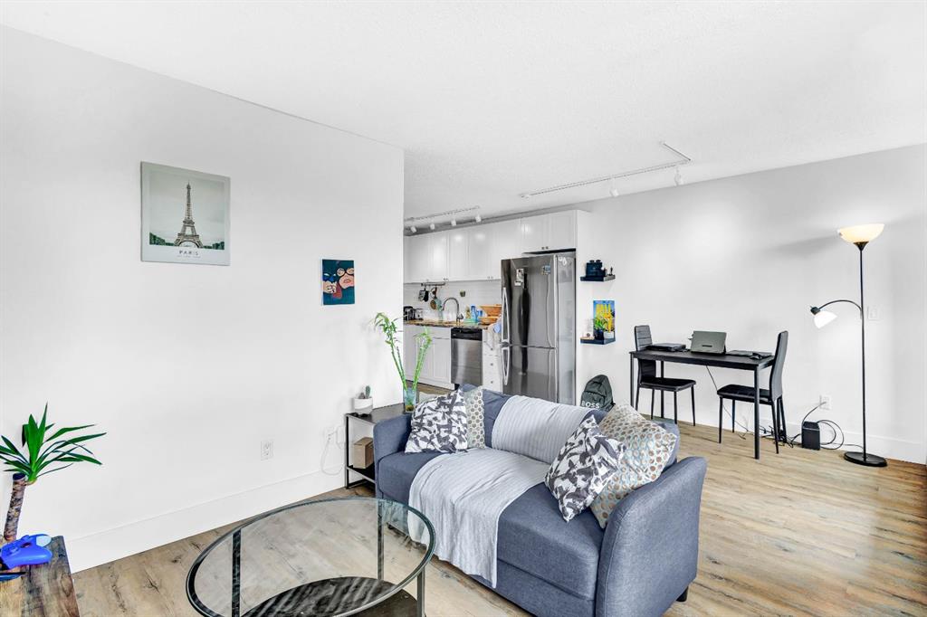 Welcome to this bright, renovated, move in ready condo in the Bankview community with downtown views and an excellent inner-city location just steps from 17th Avenue and minutes to downtown. Upon entering the unit, the updated kitchen is located to your left, while to the right you’ll find convenient IN-SUITE LAUNDRY and a storage area. Continuing into the home, the open-concept layout features a 4-piece bathroom on the right and an open dining area on the left. Straight ahead is the fully enclosed 70sqft balcony, which doubles as a flex room and works perfectly as a home office, offering beautiful views of downtown Calgary (not included in measurements). Adjacent to the dining area is an open living space that also accommodates the bedroom area, creating a functional and versatile layout. Vinyl plank flooring runs throughout, and large windows provide plenty of natural light. Located in a well-managed building with CONDO FEES UNDER $400, this home is set in one of Calgary’s most beautiful and established inner-city communities. Close to parks, schools, downtown, and just a 15-minute walk to the Sunalta CTrain. This perfect move-in ready property also comes with the option to include all existing furniture at no additional cost!