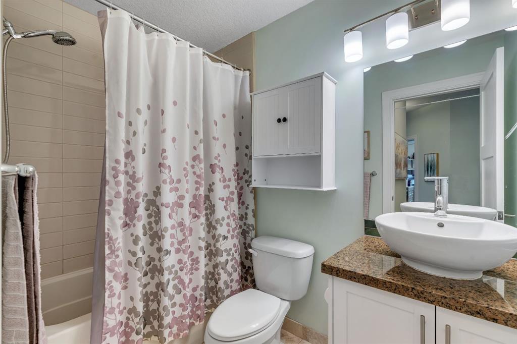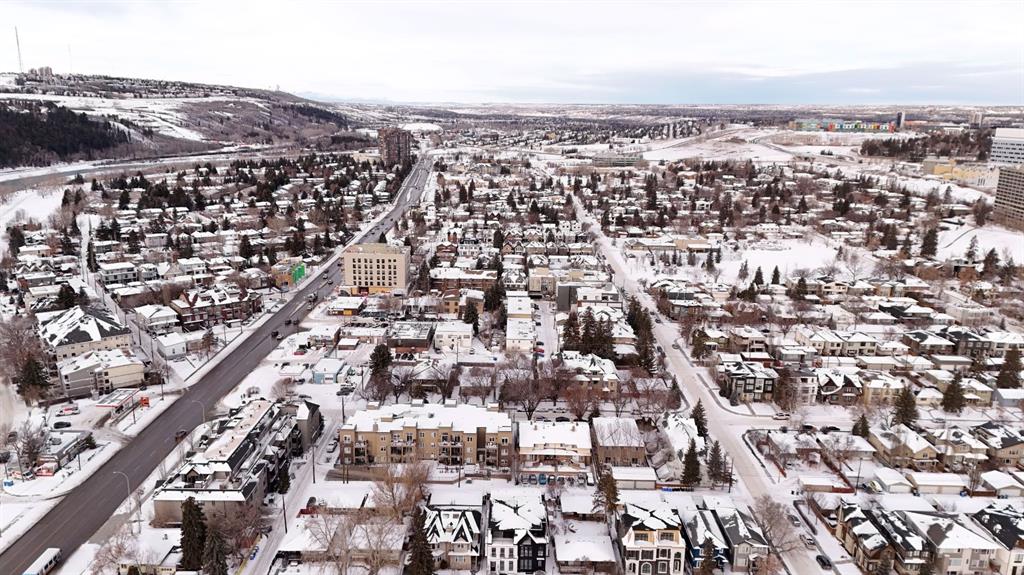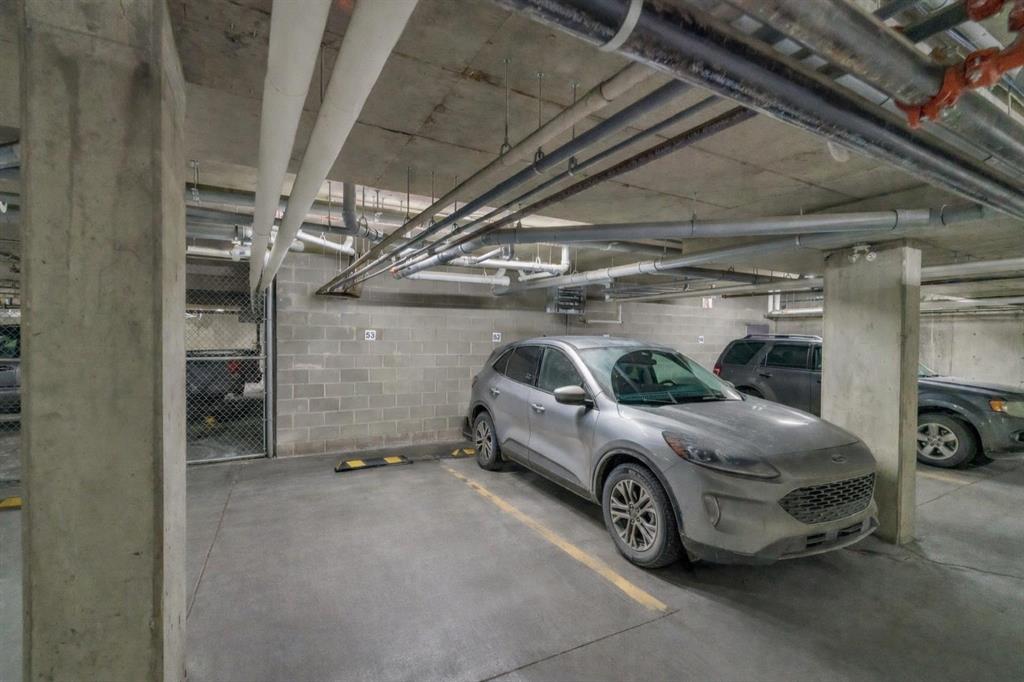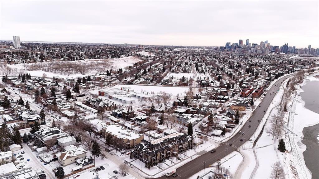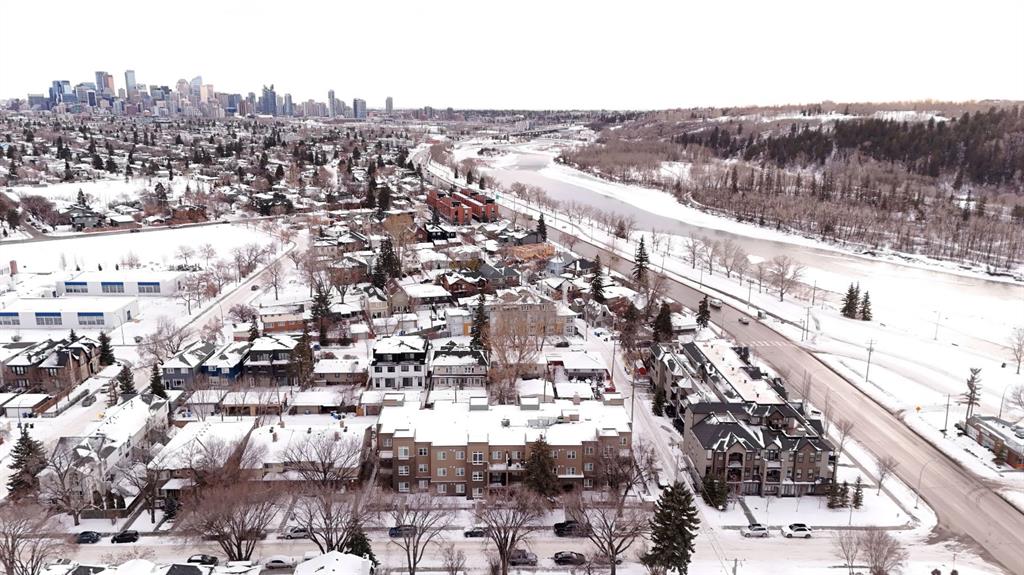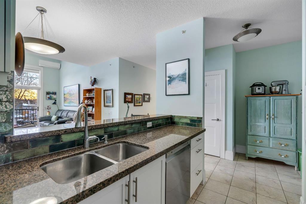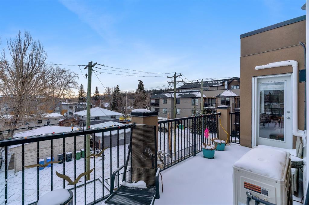 An exceptional penthouse residence in the heart of Parkdale. Positioned on the top floor, this rare offering spans over 1,000 sq. ft. and features two bedrooms, two bathrooms, two titled parking stalls, and a titled storage locker—a premium combination seldom found. Designed for both comfort and sophistication, the home showcases vaulted ceilings in the living room—a distinctive architectural feature exclusive to the penthouse level, creating an airy, light-filled atmosphere. In-floor heating, air conditioning with dual wall units, and full-size front-load in-suite laundry ensure year-round comfort and convenience. The kitchen and bathrooms are finished with double-slab granite countertops, refreshed white cabinetry, custom tile backsplashes, and LG stainless steel appliances, including a new electric range with air-fry functionality. Thoughtful upgrades such as added kitchen drawers for enhanced organization, modern vinyl plank flooring, a tiled fireplace surround, and freshly painted walls elevate the overall aesthetic. Neutral zebra blinds throughout and a motorized blind in the primary bedroom add a polished, contemporary touch. Step outside to a rare, east-facing, double-length patio, exclusive to this unit, complete with a gas BBQ hookup—perfect for morning coffee or entertaining. Additional amenities include secure underground guest parking, a car wash bay, and nearby free short-term street parking zones. The building is also outside the floodway and flood fringe zones and remained dry during the 2013 floods, offering peace of mind. Ideally located just one block from the Bow River Pathway system, and within walking distance to Foothills Medical Centre, the Cancer Centre, and major transit routes, this home is perfectly positioned for professionals. Enjoy effortless commutes to the University of Calgary, Children’s Hospital, Downtown, and Market Mall, with quick westbound access to Highway 1 for weekend mountain escapes. This is a rare penthouse opportunity that seamlessly blends elevated design, premium upgrades, and an unbeatable lifestyle location.