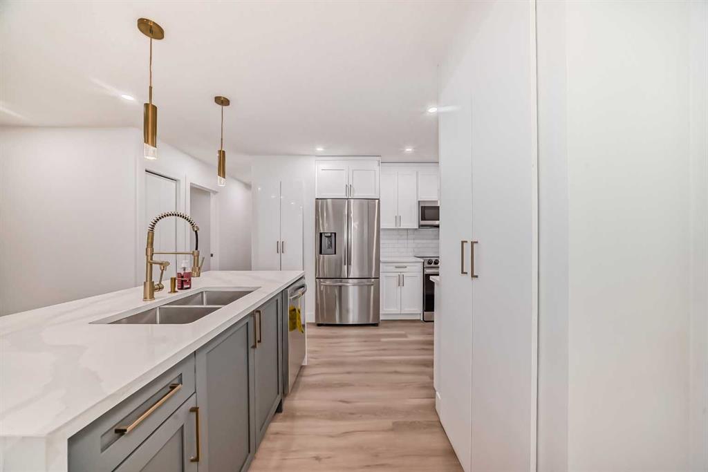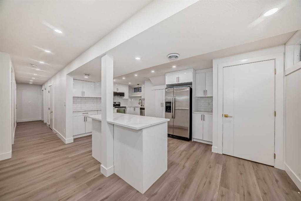 Beautiful, substantially renovated and remodeled bungalow in a superb Huntington Hills location. Original floor plan has been opened up providing spacious contemporary living spaces. 4 bedrooms up plus a new LEGAL 3-bedroom suite down. Luxury vinyl plank flooring stretches throughout the main and lower level. The oversized central island highlights the substantial kitchen. Ample amounts of crisp white cabinetry and beautiful quartz countertops. Classic subway tile backsplash. New stainless-steel appliances include a French door fridge. The adjacent open dining and living room areas are bright and spacious. Lovely primary suite features a 2-piece ensuite bath. New main bath contains a soaker tub/shower with tile surround, tiled floor and new white vanity. The lower legal suite offers a separate entrance and stress-free generational living or mortgage helper. The open plan is highlighted by a large white kitchen with loads of cabinet space and quartz countertops. Central island and stainless-steel appliances round out the kitchen. Large adjacent rec room/living room. 3 more generous bedrooms plus another new full bath complete the lower level. Updated landscaping included the removal of some intrusive trees, new deck, some new concrete walkways, new retaining wall, new sod and exterior paint and stucco. Interior updates included all new plumbing up and down, New electrical panel, new wiring down, most windows are new and window coverings, all new kitchens and baths, new plumbing hardware, new light fixtures, new interior doors, trim, baseboard and casing, new paint, new knockdown ceilings, new flooring. Quiet location backing onto a well treed greenspace. Minutes to all levels of schools, major road arteries, public transit & shopping. The total package!