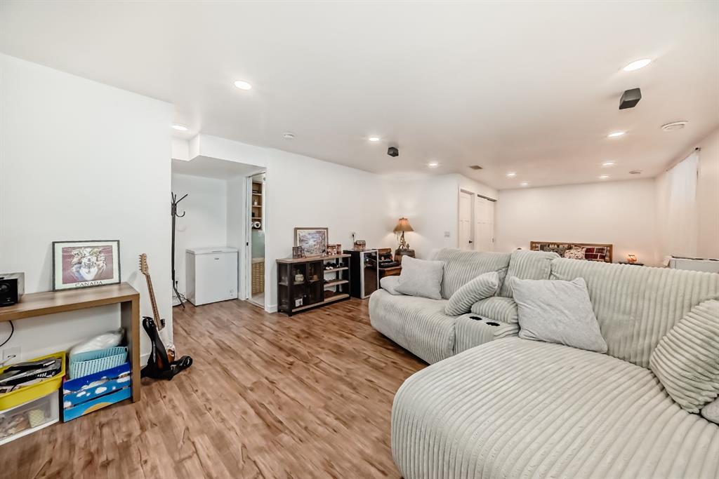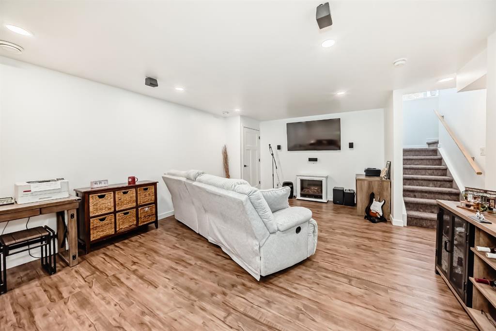 The fully finished basement offers a large recreation space and a 3-piece bathroom — plus electrical rough-in for a surround sound system. Double closets and an area for a bedroom finishes this level. Outside, the fully fenced, flat rectangular lot is ready for your vision, with hot tub electrical already roughed in.