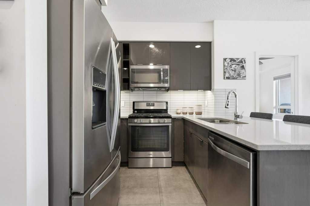 The contemporary kitchen is a standout, featuring quartz countertops, sleek cabinetry, stainless steel appliances, and a gas range—perfect for those who love to cook and entertain. A central island adds both prep space and a natural gathering point.