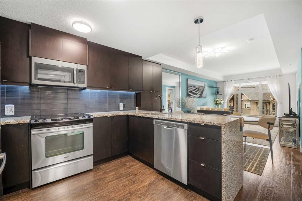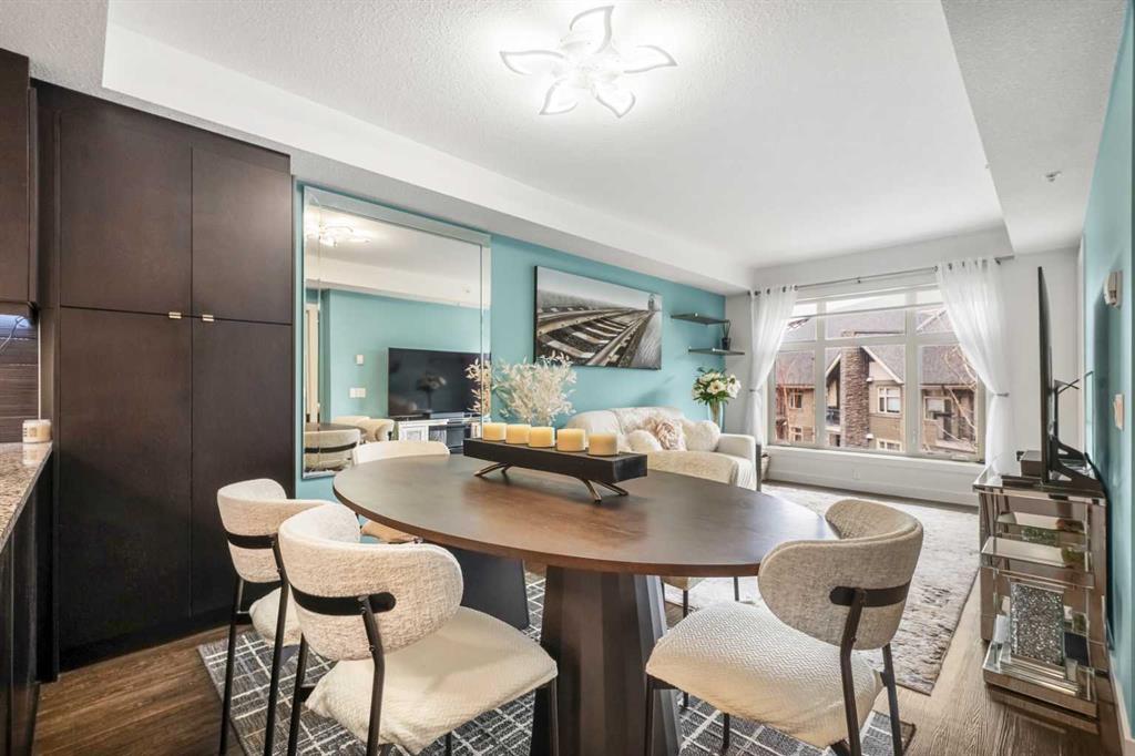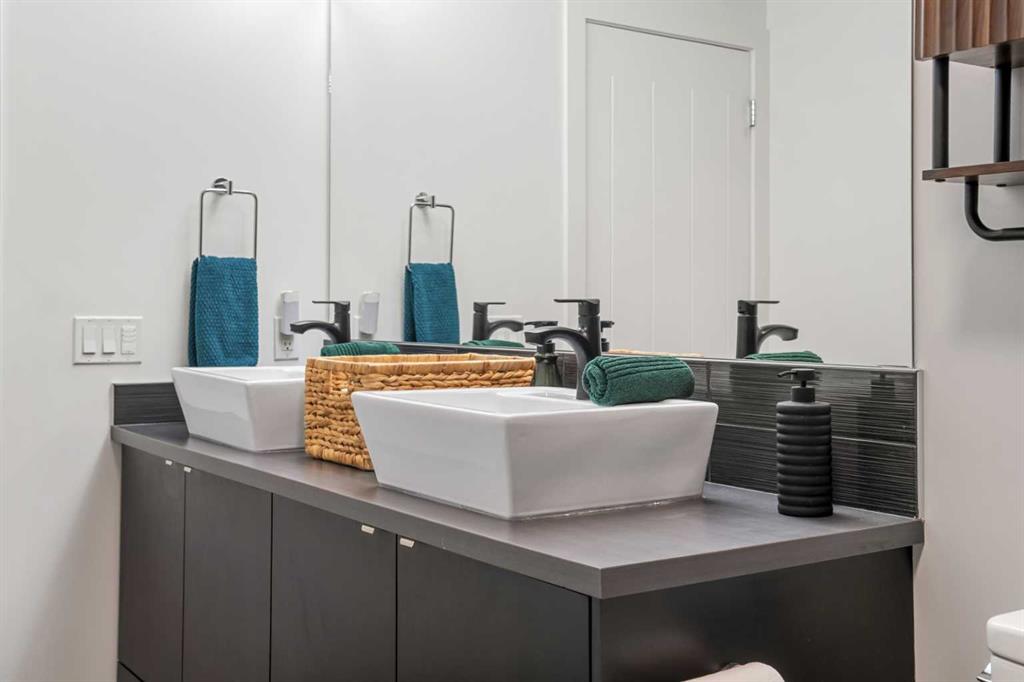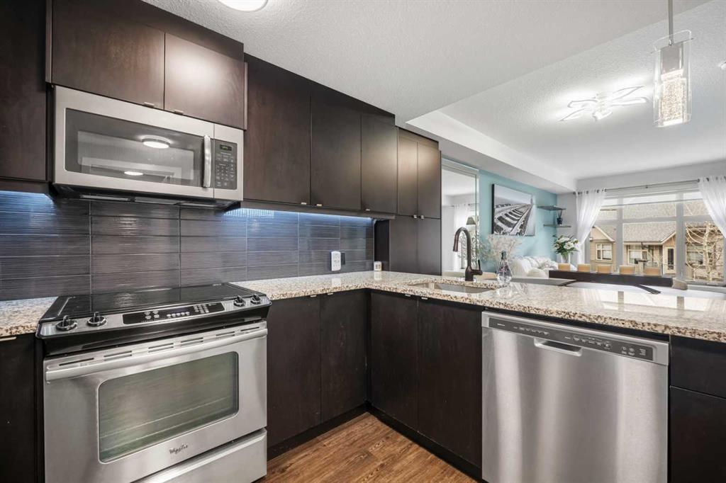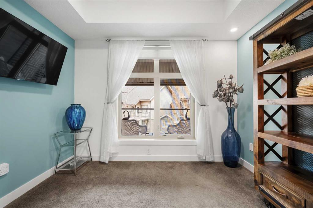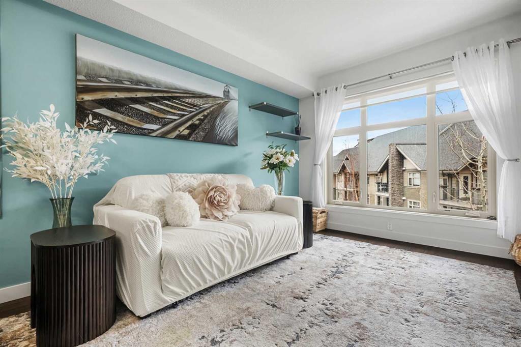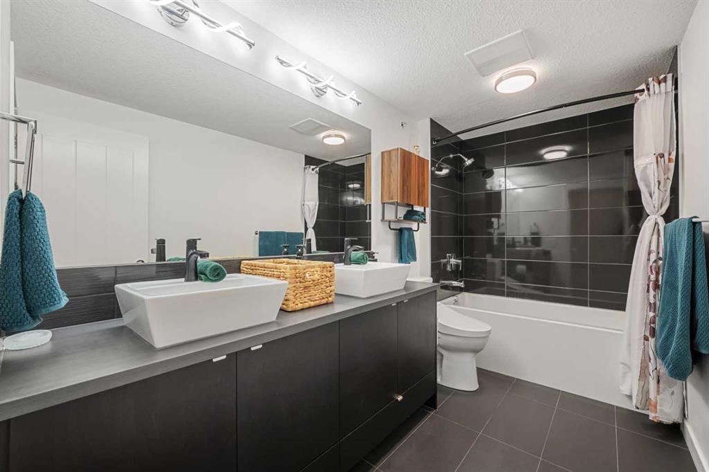 Welcome to this beautifully upgraded multi-level condo in the highly sought-after Aspen community, where modern elegance meets thoughtful design across 911.09 sq. ft. of refined living space. This stunning 2-bedroom, 2-bathroom condo stands out as one of the most desirable layouts in the building, offering exceptional privacy with a unique dual-level layout ideal for professionals, roommates, or guests. Step inside to discover a bright, open-concept main level highlighted by rich vinyl plank flooring, expansive windows, and a seamless flow between the living, dining, and kitchen areas. The contemporary kitchen is both stylish and functional, featuring granite countertops, sleek stainless steel appliances, ample cabinetry, a convenient breakfast bar with a new designer light fixture, a built-in pantry upgrade, new kitchen sink faucet, and newly added under-cabinet lighting that enhances both ambiance and functionality. The inviting living area extends onto a private balcony with the addition of a screen door, perfect for enjoying fresh air and peaceful views. The main level is completed by a beautifully updated 3-piece bathroom with a walk-in shower, new faucets, new modern medicine cabinet, and custom-made wooden shelving, along with a spacious laundry and storage room. Throughout the home, you’ll appreciate thoughtful upgrades including new paint, all-new automated lighting, and automated blinds that elevate both comfort and convenience. Upstairs, retreat to a thoughtfully designed upper level offering enhanced privacy, featuring a generous primary bedroom with a new ceiling fan/light fixture and a luxurious 5-piece ensuite complete with dual vanities, a deep soaker tub, new faucets, a new Toto toilet, a stylish medicine cabinet, and a new shower curtain rod, while the second main floor bedroom is well-sized and ideally positioned. With its functional dual-level design, private feel, and extensive upgrades, this tastefully finished, move-in ready home is a rare opportunity in one of Calgary’s most prestigious communities, just minutes from Aspen Landing, top-rated schools, parks, and transit.