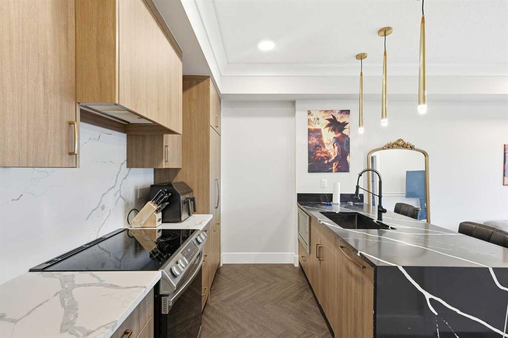 Enjoy refined city living in this beautifully finished one bedroom, one bathroom apartment, where quality craftsmanship and thoughtful design are showcased throughout. The kitchen is a true focal point, featuring warm wood-grain cabinetry, sleek quartz countertops with bold veining, a full-height backsplash, and stainless steel appliances, all centered around a large island with an undermount sink and a modern black pull down faucet. Elegant gold-accented pendant lighting and clean-lined hardware add a sophisticated touch while maintaining a timeless, contemporary aesthetic. The open concept living space is bright and inviting, complemented by wide-plank flooring and refined architectural details that create a cohesive, upscale feel. The bedroom offers a comfortable and private retreat with generous storage, while the bathroom is finished with modern fixtures and a calm, spa inspired design. Additional conveniences include titled underground heated parking, in-suite laundry, and a secure, well maintained building. This unit is located in the upscale inner-city community of Currie Barracks, and is just minutes from Mount Royal University, Marda Loop, downtown Calgary, public transit, schools, parks, shopping, restaurants, breweries, and Crowchild Trail. The neighbourhood offers exceptional walkability, green space with everyday urban convenience, making it ideal for professionals seeking a polished, low-maintenance lifestyle. Check out the 3D virtual tour available.