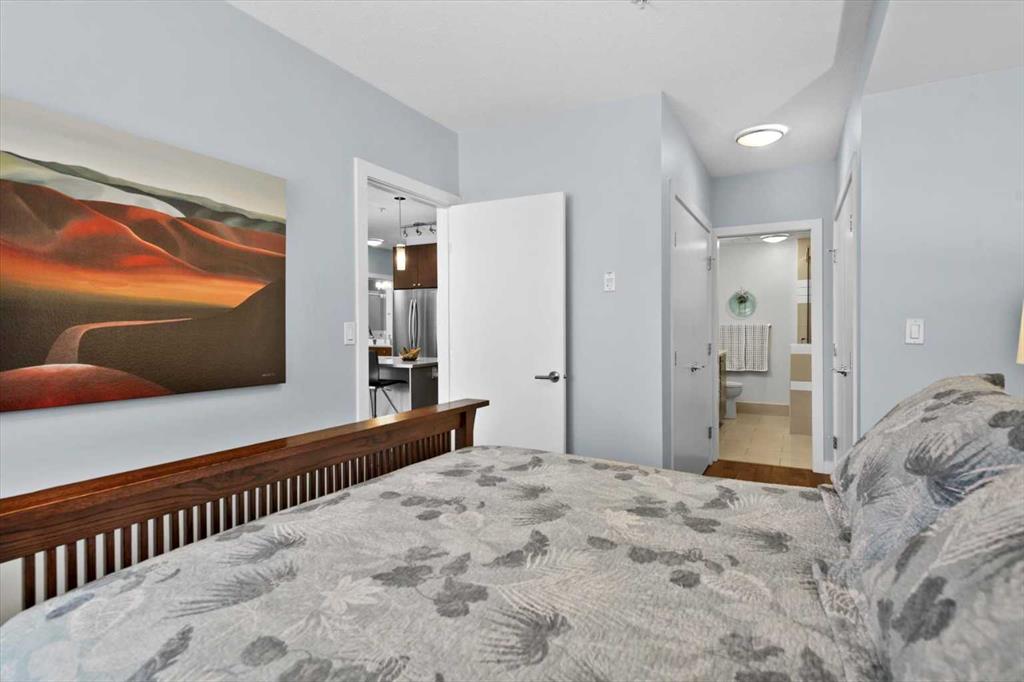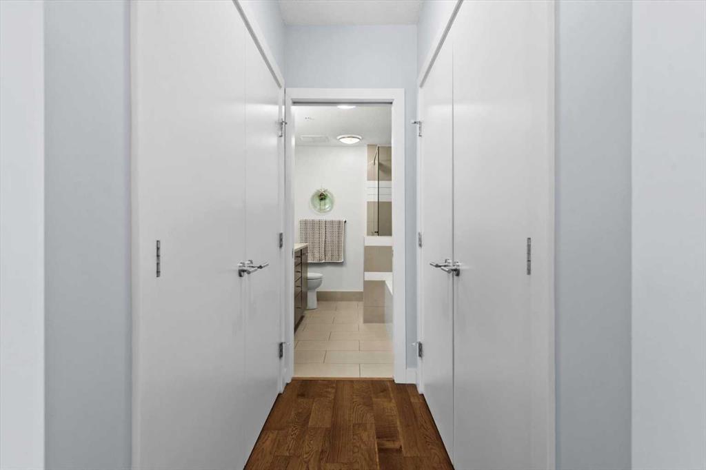 The covered south-facing balcony invites year-round enjoyment, complete with a gas line and intimate balcony seating. In-floor heating ensures warmth through Calgary’s winters, while the addition of air conditioning provides welcome relief in the summer months. UNO is a well-managed, boutique building supported by a proactive and engaged board, with condo fees kept at a reasonable level and backed by a strong, 2025 Reserve Fund Study. Residents also enjoy access to a serene, shared courtyard deck and garden; an unexpected retreat tucked quietly behind the property. Inside, this home is both inviting and functional, ideal for relaxing or entertaining. The spacious primary suite comfortably accommodates a king-sized bed and features a walk-through closet leading to a luxurious five-piece ensuite with dual vanities, a soaker tub, and an upgraded glass shower. Thoughtfully separated for privacy, the second bedroom or optional den, includes its own walk-through closet and direct access to a stylish three-piece cheater ensuite. An oversized titled underground parking stall, secure assigned storage locker, bike room, and an exceptional Royal Avenue SW address. A home that effortlessly combines comfort, style, and location; this is lower mount Royal living at its finest.