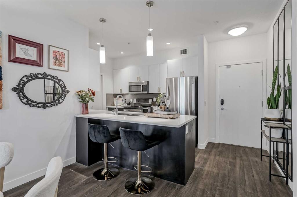 Tremendous opportunity and affordability await you at Stonecroft at Auburn Bay—where comfort meets convenience in one of Calgary’s most desirable lake communities. This modernized south-facing 2-bedroom, 2-bathroom condo offers a bright, open layout designed for both style and functionality. The contemporary kitchen features sleek quartz countertops, stainless steel appliances, and large windows that fill the space with natural light. Step out onto your private patio to enjoy peaceful moments and mountain views. The spacious primary bedroom includes a walkthrough closet leading to a beautiful ensuite complete with a soaker tub and separate shower. The second bedroom and full 4-piece bathroom provide flexibility for guests, a roommate, or a home office. Additional highlights include convenient in-suite laundry with extra storage, a heated and secure underground parking stall, and an assigned storage locker for added peace of mind. Perfectly situated across from the South Health Campus and just minutes from the Seton YMCA, Cineplex VIP, restaurants, and shops, everything you need is within reach. As a resident of Auburn Bay, you’ll also enjoy year-round lake privileges with access to the private beach, walking paths, and a vibrant community that truly feels like home. You’re going to love living here!