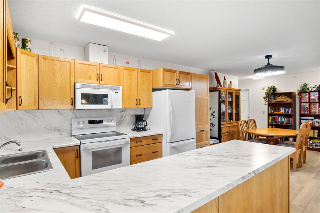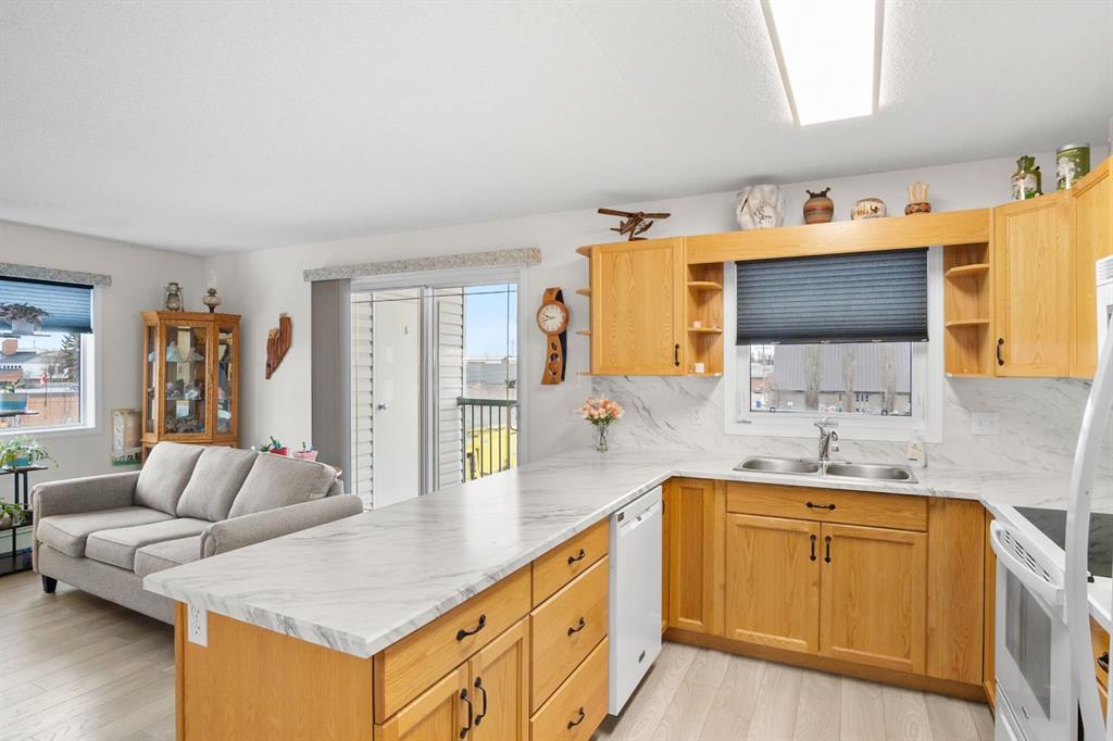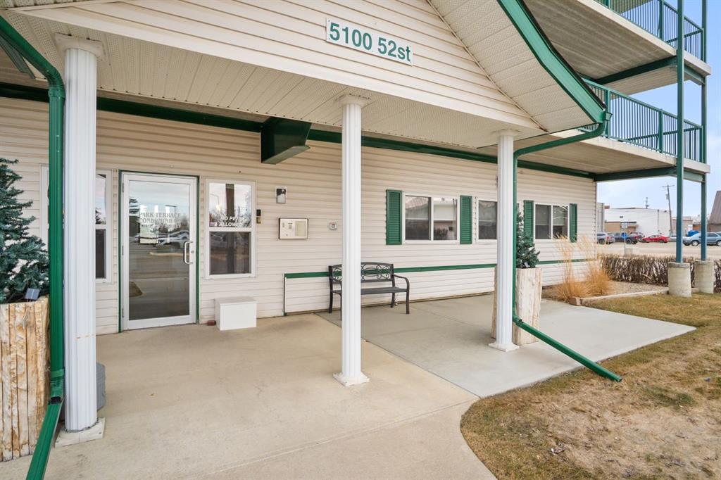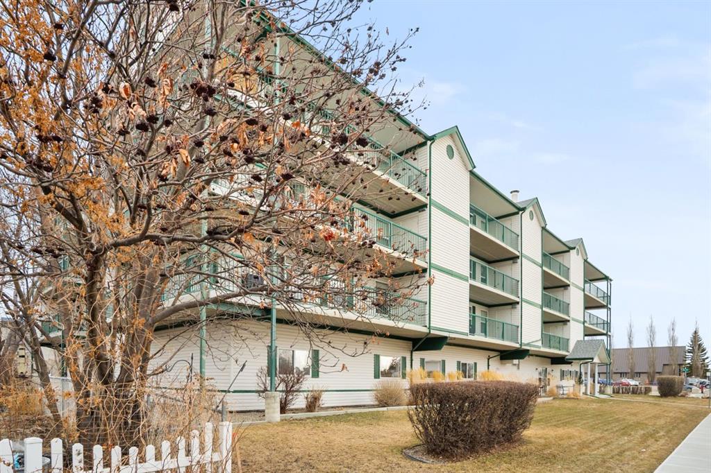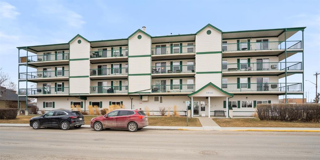 Come home to this 55+, bright, very well located home located in Park Terrace in Olds. This corner unit, with a generous open concept 2 bdrm, 2 bath home features numerous recent upgrades. Upgrades include some fresh paint, and new lighting, new dishwasher and stove, as well as a great in kitchen pantry cupboard. Enjoy your morning coffee watching the sun rise in the East. You will appreciate the tasteful decor, the well designed kitchen featuring a sun filled window over the sink. You will also be thankful for the building design which features concrete slabs between building floors allowing for additional safety measures as well as a quieter home. This building is conveniently located across the street from Olds Sportsplex, easy walk to downtown restaurants and shops, and Centennial Park. Do not delay – this condo will not last!