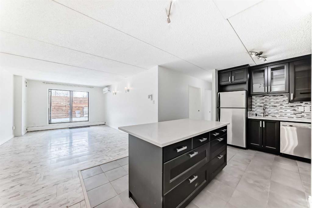 Welcome to this bright, once renovated 2 Bedroom, SOUTH-FACING CORNER UNIT in STONEHAVEN, 900 sq ft condo in Calgary’s vibrant Beltline—offering space, comfort, and standout features you won’t often find. Enjoy an open-concept living area with Boheme Oak AC5 (top-tier durability!) laminate flooring and a stylish island kitchen with quartz countertops, stainless steel appliances, breakfast bar and full pantry—perfect for everyday living and entertaining. The most attractive selling features is a massive, wood-fence, private patio with room for patio furniture, plants, BBQ, and even a hammock—your own outdoor retreat the city.– Other selling features include: In-suite A/C mini-split (a rare upgrade), Pet-friendly environment (dogs & cats welcome), Secure covered assigned parking stall (#50), Condo fees that include heat, water & electricity, and common space security cameras, Pre-installed Telus fibre internet in the unit (getting your own dedicated fibre internet connection is just one phone call away), 2 spacious bedrooms (one with patio access + optional built-in Murphy bed), Updated 4pc bathroom with tile backsplash + quartz counters, a massive in-suite storage room (optional 1.5 year old chest deep freezer). Laundry just steps away on each floor, Solid concrete building (no post-tension cables). With a NEAR PERFECT Walk Score of 99 and Bike Score of 95, you’re steps from everything. A rare opportunity to own a versatile, move-in-ready home in an unbeatable location! Don’t forget to click on our 3D TOUR!