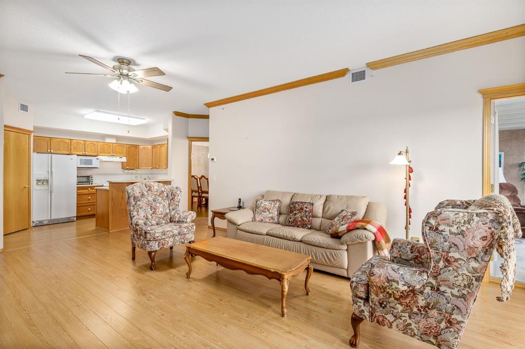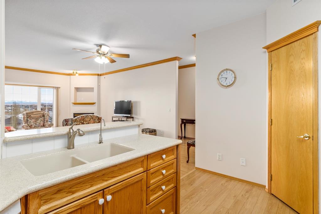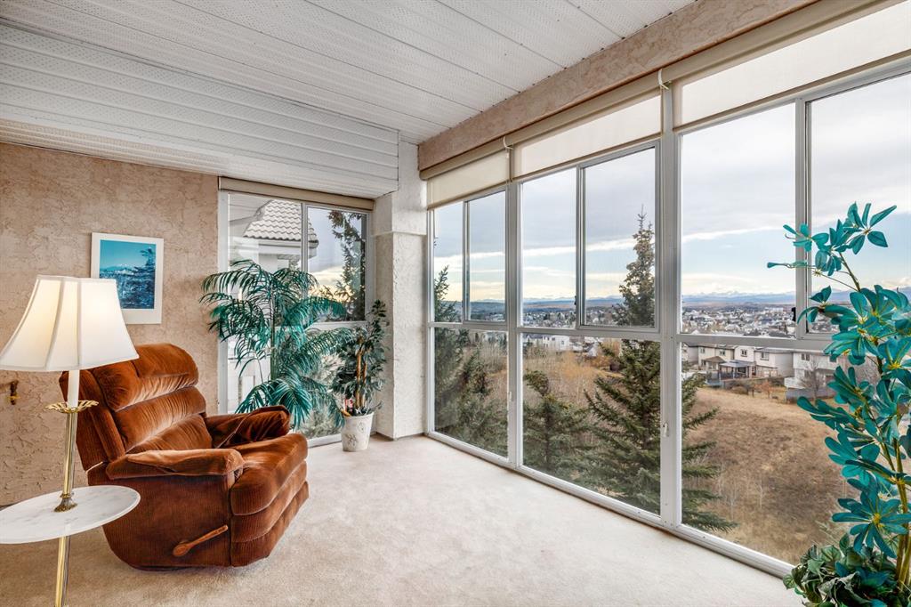 The open-concept kitchen includes an eating bar and flows seamlessly into the spacious living and dining areas, perfect for entertaining. Enjoy morning coffee or evening sunsets in the sunroom, framed by panoramic views of the Rockies.