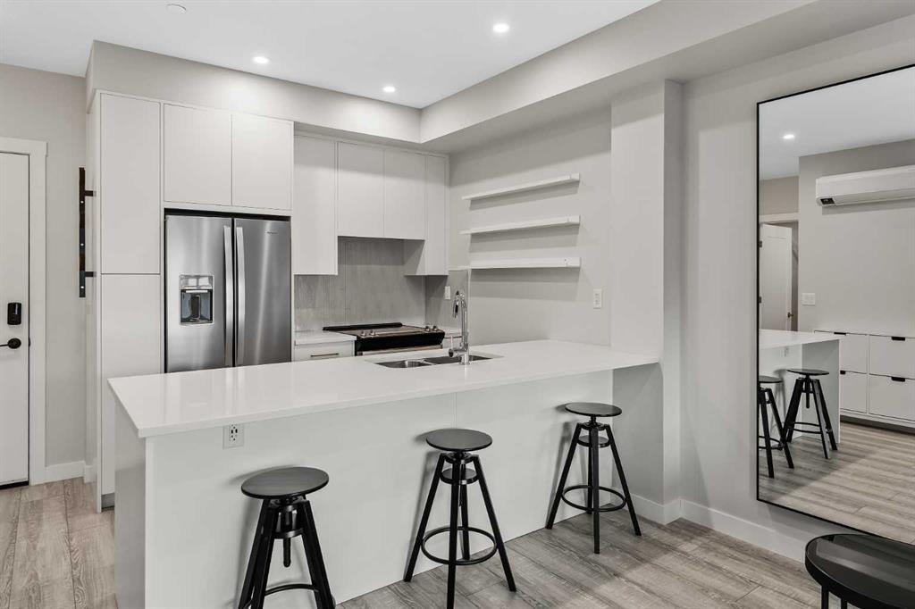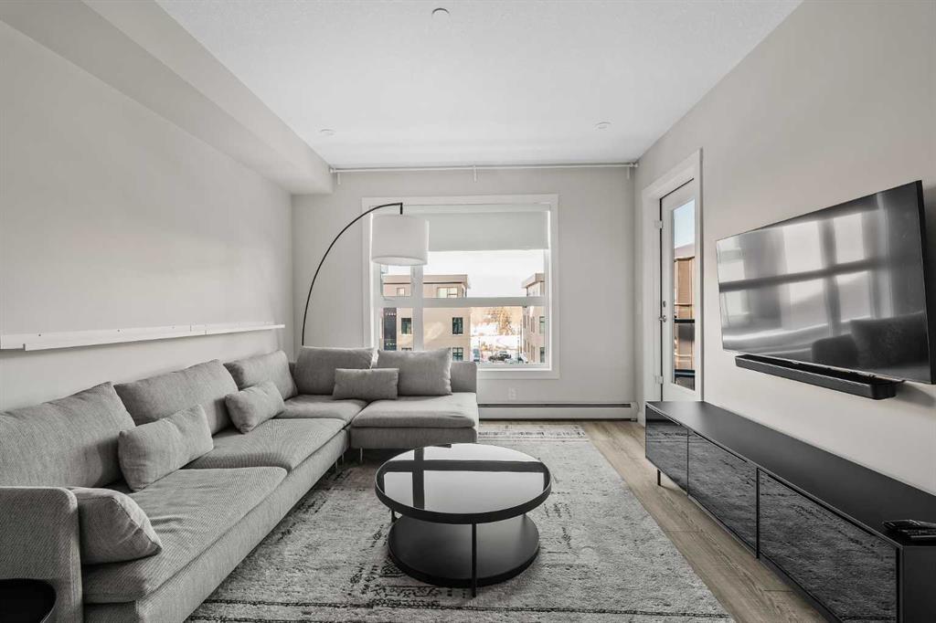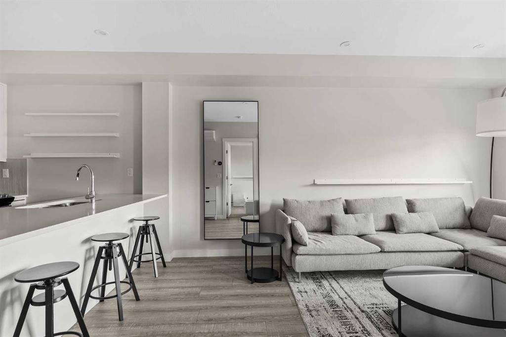ALL FURNISHINGS INCLUDED! Move in TODAY! Welcome to Capella in the award-winning University District—where modern luxury, thoughtful design, and unbeatable convenience come together in one exceptional home. This beautifully appointed residence showcases a spacious, open-concept floorplan enhanced by elegant luxury vinyl plank flooring and expansive windows that frame views of Capella’s serene, landscaped courtyard. The gourmet kitchen is designed for both style and function, featuring full-height cabinetry, quartz countertops, and an oversized peninsula with seating for four—perfect for morning coffee, casual dining, or entertaining guests. The bright bedroom overlooks the private balcony (w/gas bbq hookup) and the lush courtyard below, offering a peaceful retreat at the end of your day. A spa-inspired 3 pce bathroom elevates daily routines with quartz countertops, a chic tile backsplash, an oversized mirror, and a sleek floating shelf for additional storage and style. Built with above-and-beyond sound attenuation, this home provides exceptional quiet and comfort—allowing you to fully enjoy the tranquility of the surrounding green space. Capella’s Built Green Gold certification ensures high energy efficiency and long-term cost savings, delivering a home that feels as smart and sustainable as it is luxurious. Residents of Capella enjoy premium amenities including secure underground parking, a private storage locker, ample visitor parking, and a fully equipped fitness centre. All of this is located in the heart of University District, one of Calgary’s most vibrant and walkable communities. Steps from your door, you’ll find trendy restaurants, cafés, boutique shopping, fitness studios, grocery stores, a movie theatre, and everyday conveniences. The Alberta Children’s Hospital, the University of Calgary, and an abundance of parks and pathways are all just moments away.