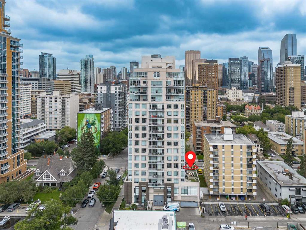 Welcome to this gorgeous 1 bedroom, 1 bathroom condo in one of Calgary’s most desired buildings, The Drake. This home really does have it all with 492 square feet of living space and an ABSOLUTELY MASSIVE TERRACE. As you walk in you are greeted with beautiful dark wood floors throughout the home starting with your kitchen, equipped with stainless steel built-in appliances, glass cook-top, granite counter tops, and a eat up bar area. Your kitchen flows into your living room making for a perfect entertaining space and is wrapped with floor to ceiling windows overlooking your expansive terrace. Your bedroom is large enough for all of your bedroom furniture and has a pocket door for direct access to your full bathroom. The terrace of this unit is ONE OF THE LARGEST IN THE BUILDING and is really what makes this unit special as there are only a few units that offer such a large outdoor space. This space is great for entertaining, BBQ’ing with friends and family, gardening, morning coffee or just basking in the sun. Truly a unique offering. The home comes with titled underground parking and a titled storage unit. The Drake is one of the most sought after buildings in Calgary being steps away from 17th avenue shops, restaurants, parks, pathways and not far from the river. There are great schools in the area and access to transit to get wherever you need to go in the city. Do not miss out on this opportunity to own this great home with huge outdoor space in a wonderful building.