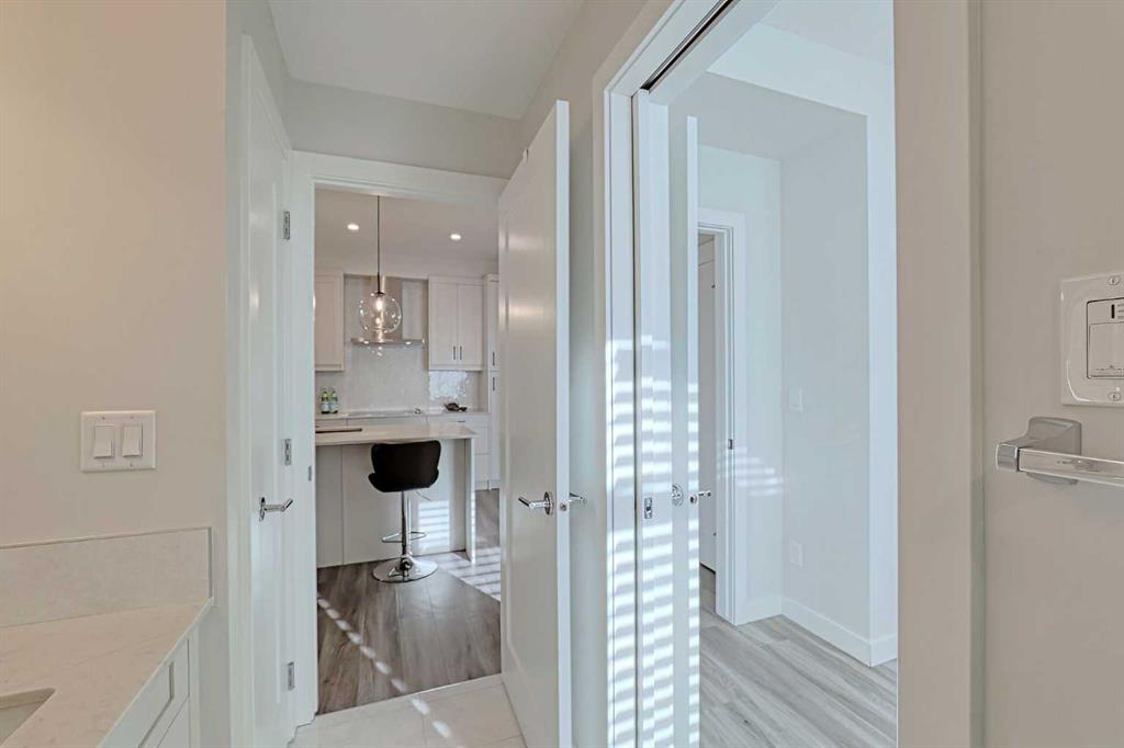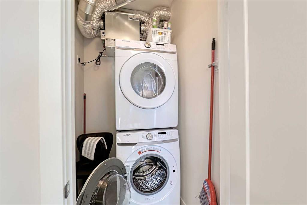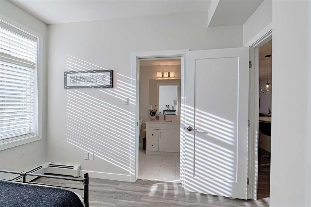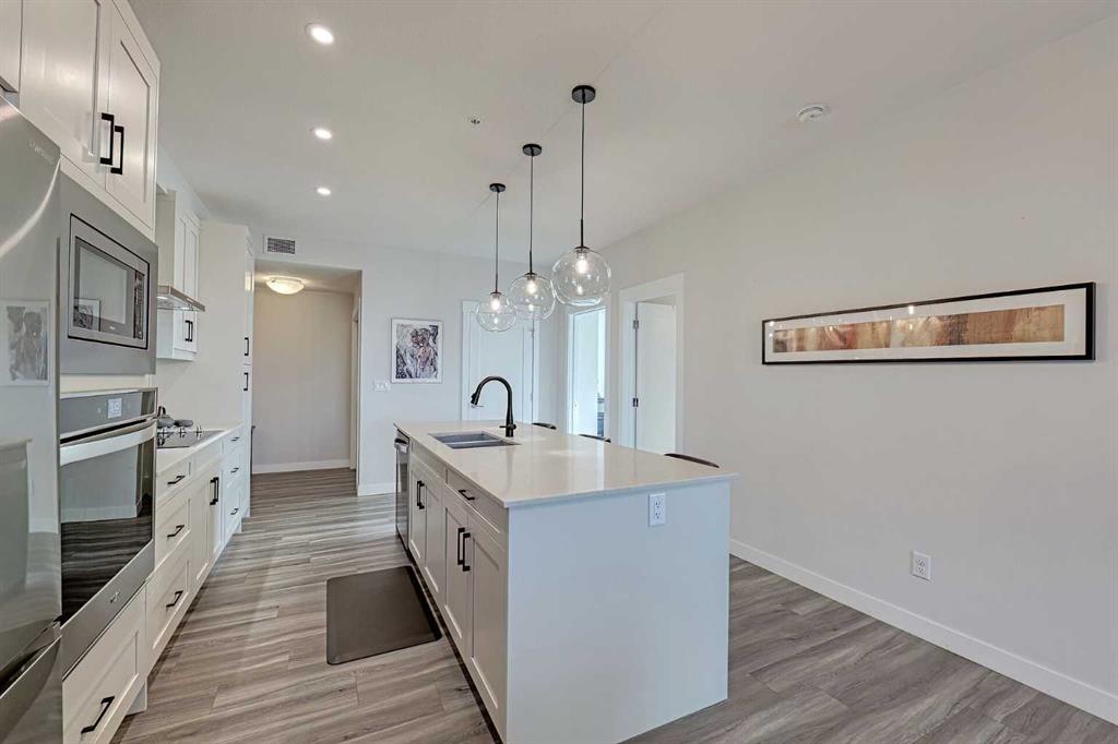 Bright and spacious end unit with 25 foot balcony and extra windows for bright, warm, natural light! You’ll love this 2-bed 2-bath Atwood model by quality builder Logel Homes, one of the largest units in the complex. Fabulous open floor plan with a huge balcony overlooking the courtyard. Oversized entry way with coat closet and room for a bench or additional shoe storage. Lovely white kitchen with quartz counters, tiled backsplash and contemporary lighting. Stainless steel appliance package includes electric cooktop, wall oven, built-in microwave, industrial-style hood fan, dishwasher, fridge with ice and water line and bottom-mount freezer. Primary Suite with big walk-in closet and 4-piece ensuite. Cheater ensuite opens to second bedroom with second door to the main living area. Easy-clean vinyl plank flooring throughout. Stacked washer and dryer in-unit. Wall unit air conditioning keeps you cool in summer. Heated underground parking 4309 is titled. Assigned storage locker 4309 located at the front end of the parking stall. Mailboxes are in the lobby, garage and recycling are in a separate building just steps away. Pets allowed with written board approval and must be licensed and vaccinated. Very walkable to major shopping and amenities. Easy access to Stoney and Deerfoot Trails. Auburn Rise is clearly a cut above. Come see for yourself. We can’t wait to show you around. Love where you live!