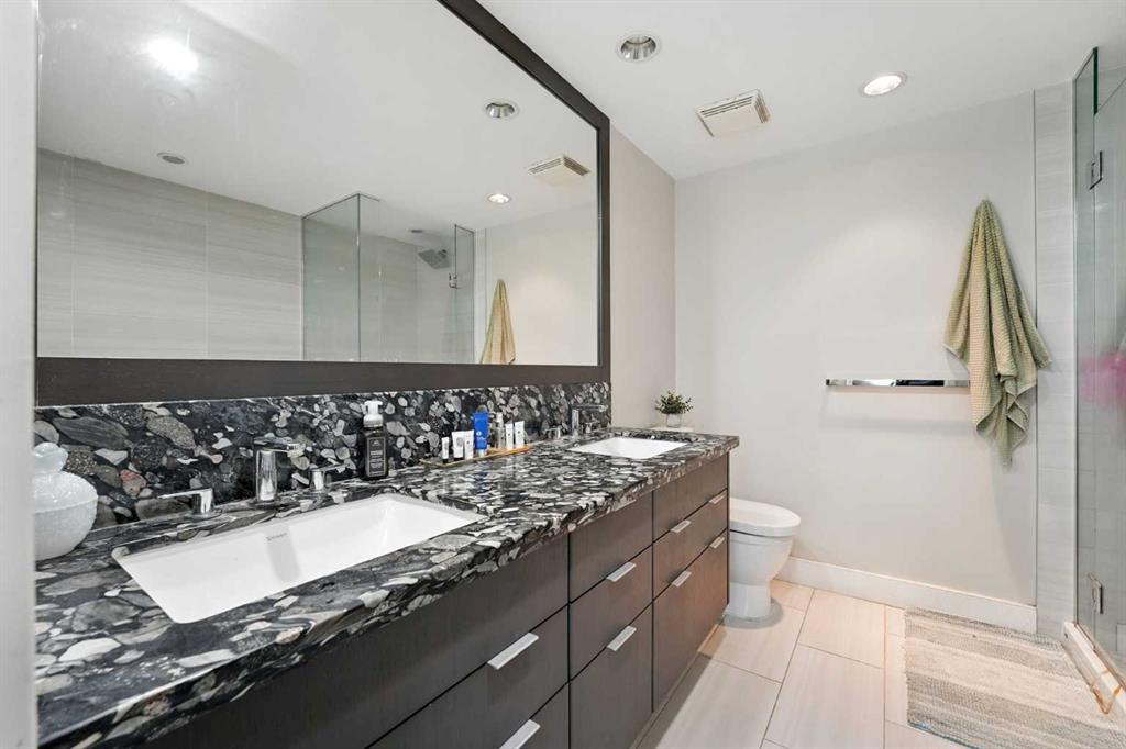This is a space where style meets function. The bright, open-concept layout is framed by floor-to-ceiling windows that fill the home with natural light. The contemporary kitchen features a gas range, granite countertops, and stainless steel appliances—perfect for a quick meal or a gourmet dinner. Both bathrooms offer the luxury of heated floors, while the primary ensuite boasts dual sinks and a separate tub and shower. Central A/C, in-suite laundry, and secure underground parking and storage add to the low-maintenance appeal.