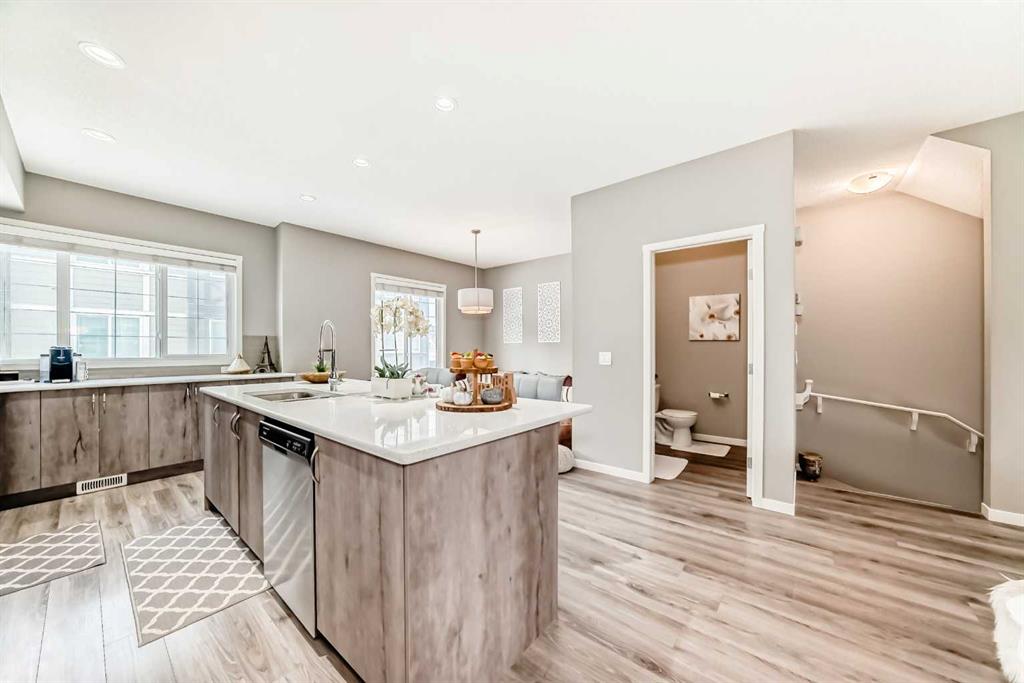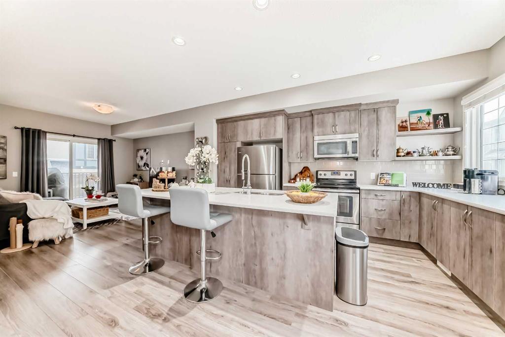 The bright and open main level is flooded with natural light throughout the day, creating an ideal space for both everyday living and entertaining. Contemporary laminate flooring flows seamlessly through the main living area, while large patio doors lead to a private balcony and further enhance the home’s airy feel. The kitchen overlooks the dining and living rooms, making it perfect for keeping an eye on kids or engaging with guests.