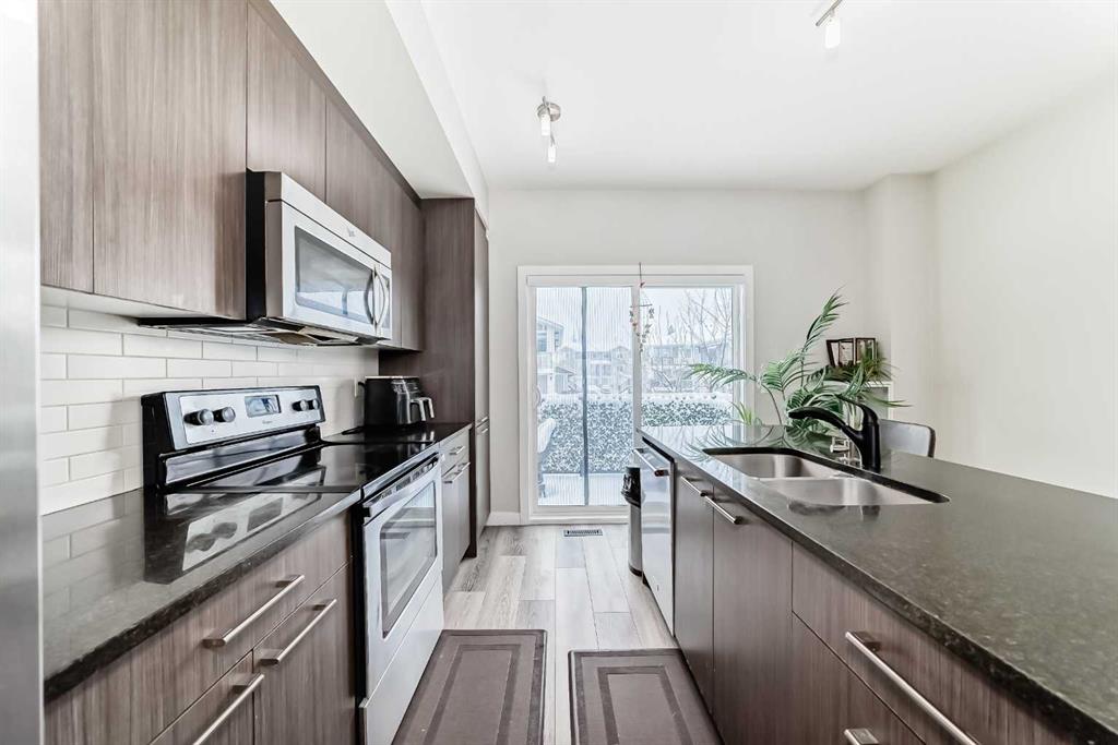 The bright main floor features a spacious entryway, sunny den/office, 2-piece bath, and access to the attached garage with epoxy flooring. The modern kitchen offers stainless steel appliances, granite countertops, a large eat-up island, and access to the first balcony with gas line for BBQ. The open-concept dining and living area leads to a second sunny balcony, perfect for relaxing or entertaining.