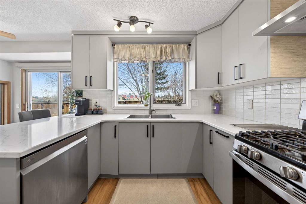 The beautifully renovated Kitchen is both stylish and functional, featuring quartz countertops, full-height cabinetry, stainless steel appliances, gas stove, modern backsplash, and peninsula seating. Large windows above the sink overlook the backyard and Greenspace beyond. The sunny West-facing Nook opens through patio doors to the fully fenced and low maintenance backyard oasis with mature trees, terraced stonework, and direct gate access to Greenspace and Tom Baines School. The two-tier Deck offers multiple seating areas to relax and enjoy the peaceful setting with no neighbors behind.