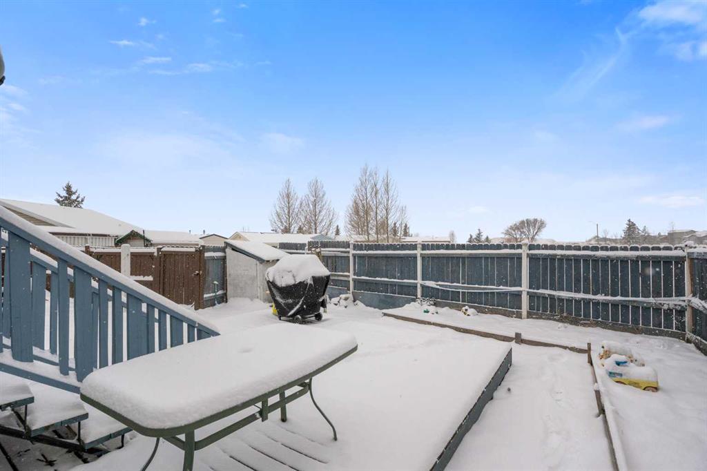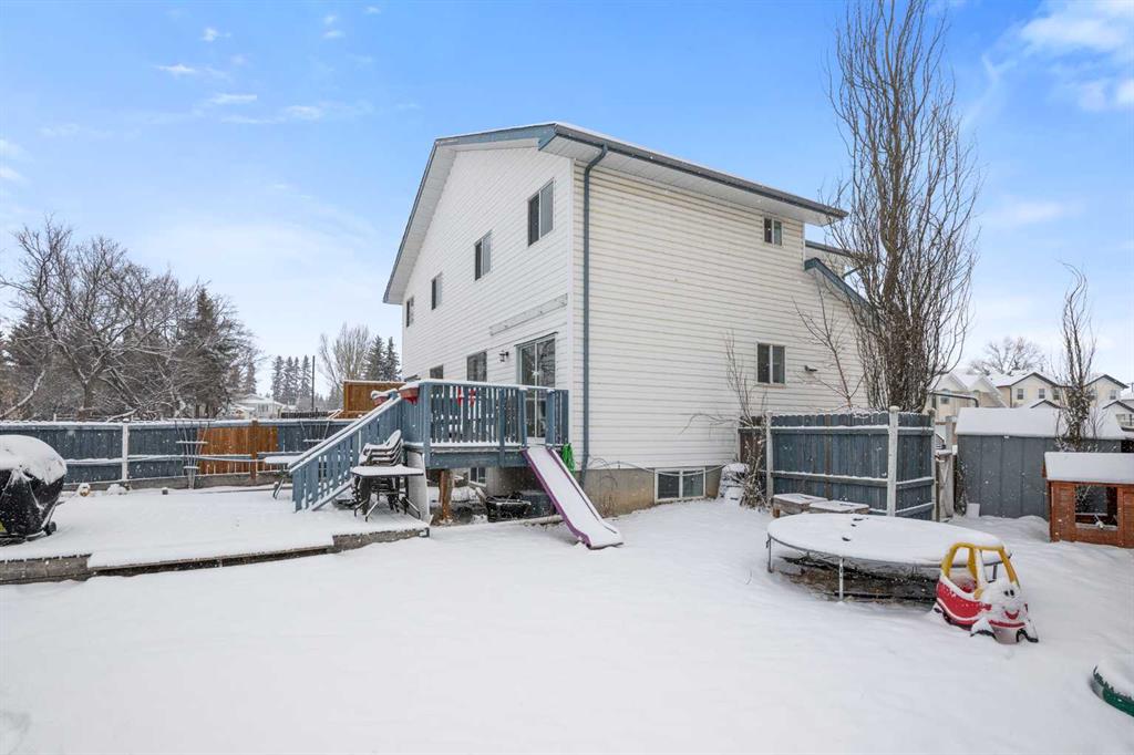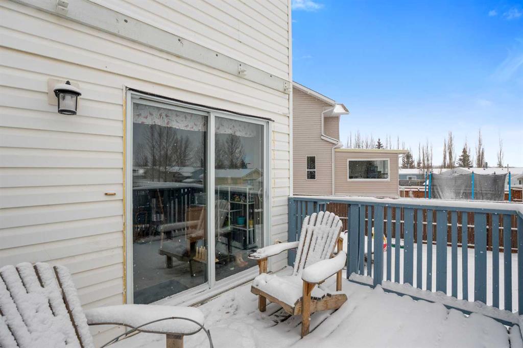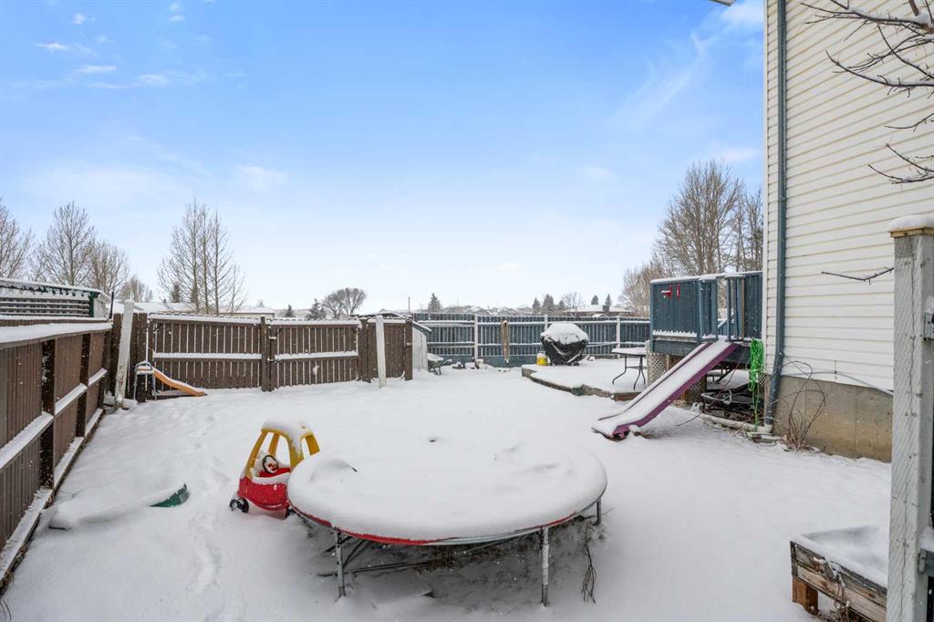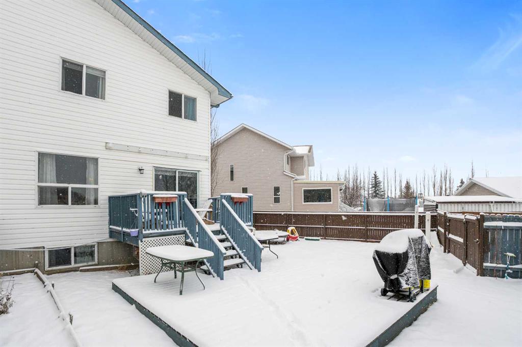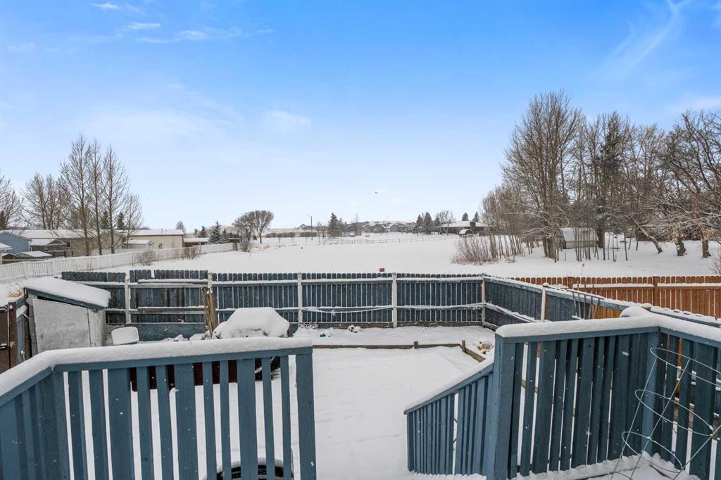 Outside, the pie-shaped lot creates a spacious backyard that offers more room than many properties in the area—perfect for kids, pets, gardening, or simply enjoying outdoor space. Parking is another standout feature. In addition to the single detached garage, the property includes two additional rear parking spaces, something that is rarely found on this style of home in Crossfield and especially valuable in a cul-de-sac location where street parking can be limited. The location adds to the appeal. Situated on the south side of Crossfield, the property is close to shopping and everyday services. Murdoch Park, with its playground and community pathways, is nearby, while the Crossfield Fish Pond, community dog park, and Collicutt Siding Golf Club are all just a short drive away.