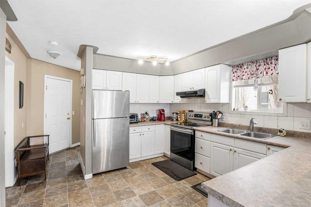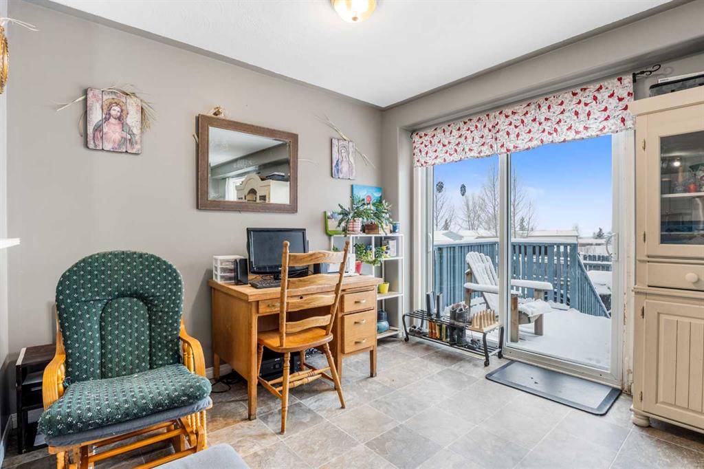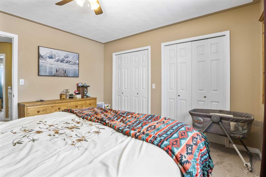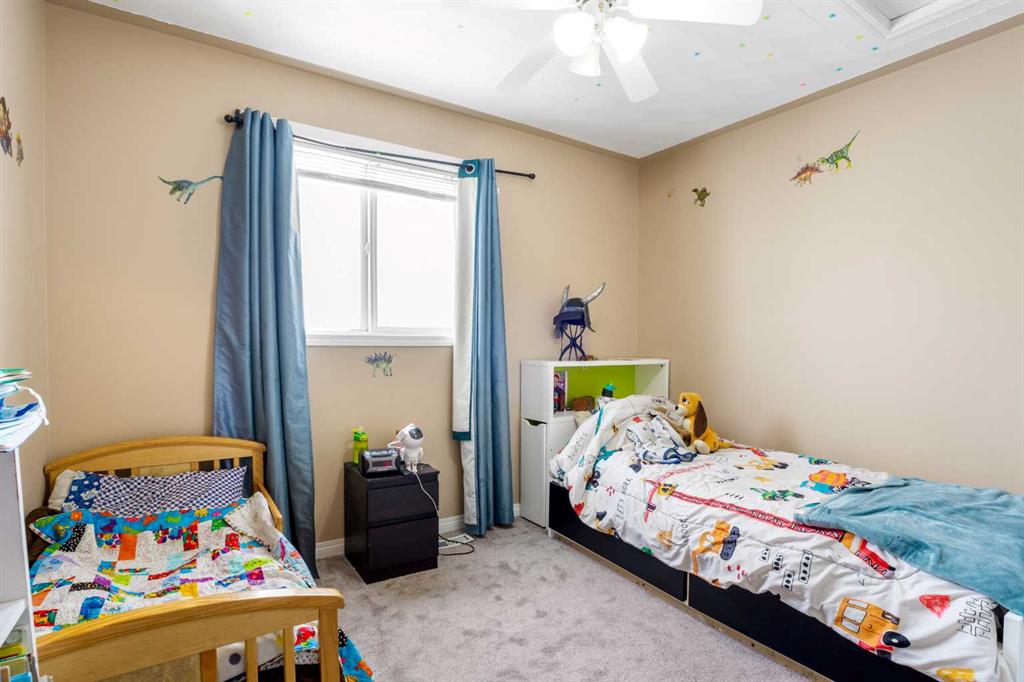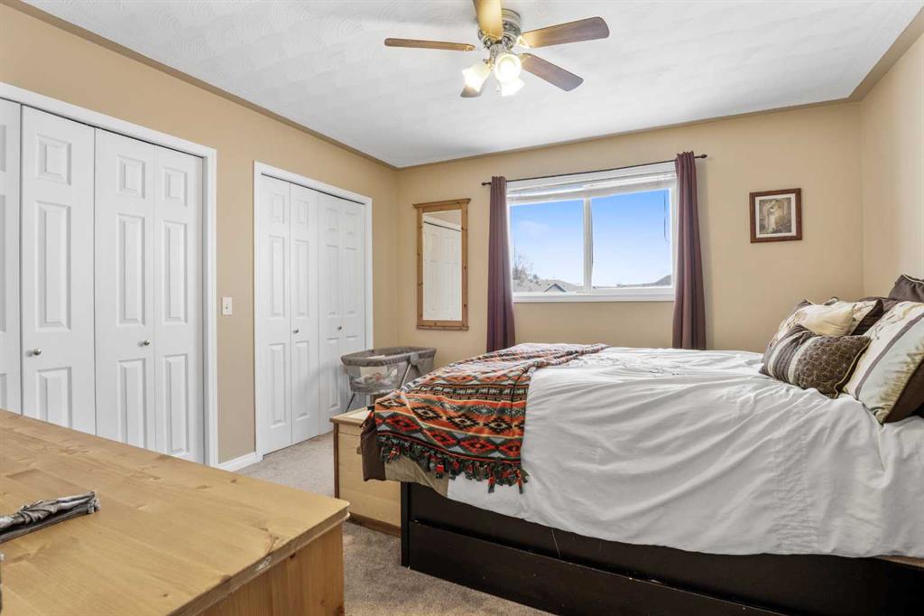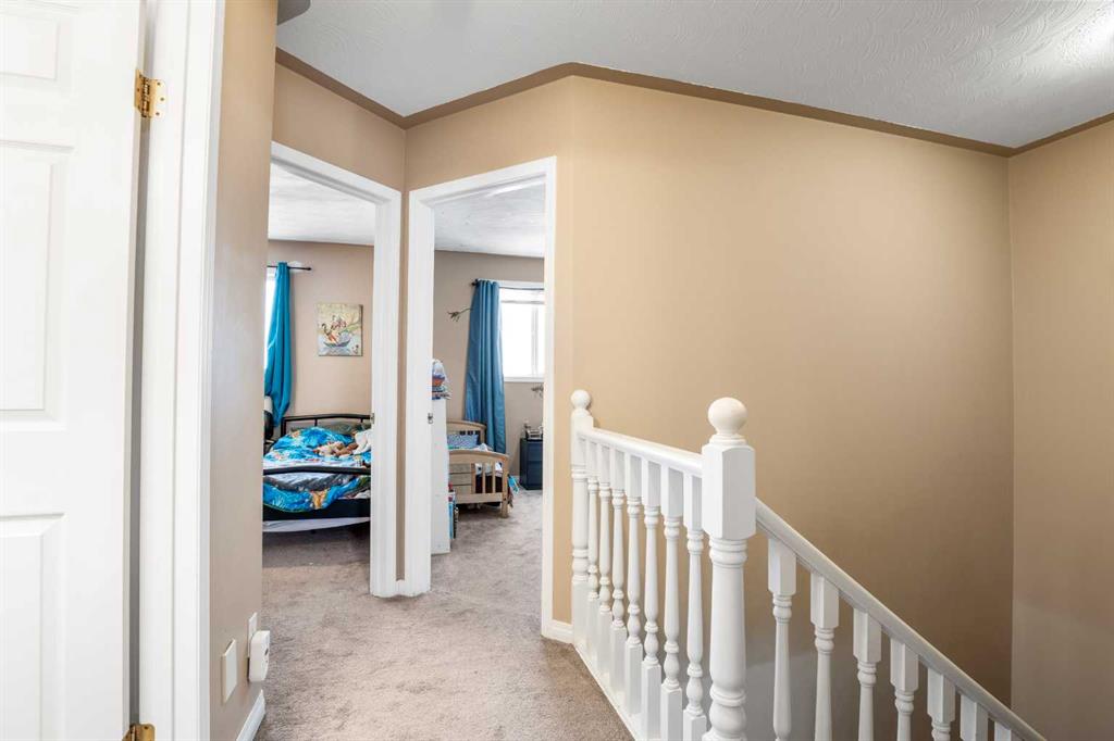 Outside, the pie-shaped lot creates a spacious backyard that offers more room than many properties in the area—perfect for kids, pets, gardening, or simply enjoying outdoor space. Parking is another standout feature. In addition to the single detached garage, the property includes two additional rear parking spaces, something that is rarely found on this style of home in Crossfield and especially valuable in a cul-de-sac location where street parking can be limited. The location adds to the appeal. Situated on the south side of Crossfield, the property is close to shopping and everyday services. Murdoch Park, with its playground and community pathways, is nearby, while the Crossfield Fish Pond, community dog park, and Collicutt Siding Golf Club are all just a short drive away.