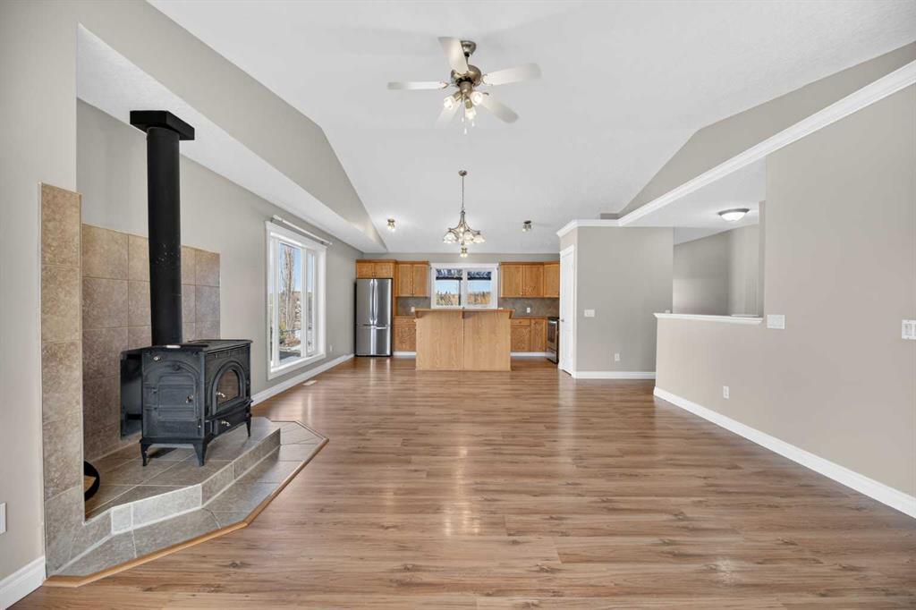 THIS COULD BE YOUR NEXT HOME!!! If you are looking for a quiet neighborhood in Didsbury for your family to move into you will want to check out this lovely home! This fully finished bungalow is in one of the best locations in town considering there is green space directly behind you and there is a walking trail for you to utilize that allows you to get out and enjoy the scenery here. Step inside and you will notice there is an open floor plan with vaulted ceilings. The living room has a WOOD BURNING STOVE great for those colder winter days and there is CENTRAL AIR for those blustery summer days. The kitchen has a large island with eating bar, tiled backsplash, newer appliances and there is that great view out to the back yard. The primary bedroom has a walk in closet and full ensuite plus there are two other bedrooms on the main level. There is also a full bathroom, laundry area and access out to the covered rear deck which makes sitting outside really nice. Heading downstairs to the finished basement you will find a large family room with convenient wet bar (fridge is included); this provides you more space for those get togethers and is very comfortable with the infloor heat. There are two more bedrooms, another full bathroom, a storage room and mechanical room to complete this home. Parking is covered here too with a double detached garage and there is a shed in the backyard that may double as a playhouse for the kids. You really feel like you are living in the country here sitting on that back deck and taking in the view! This home is ready for you to move right into and will provide many happy years for your family. The neighbors are even really nice! Call today to book a viewing!