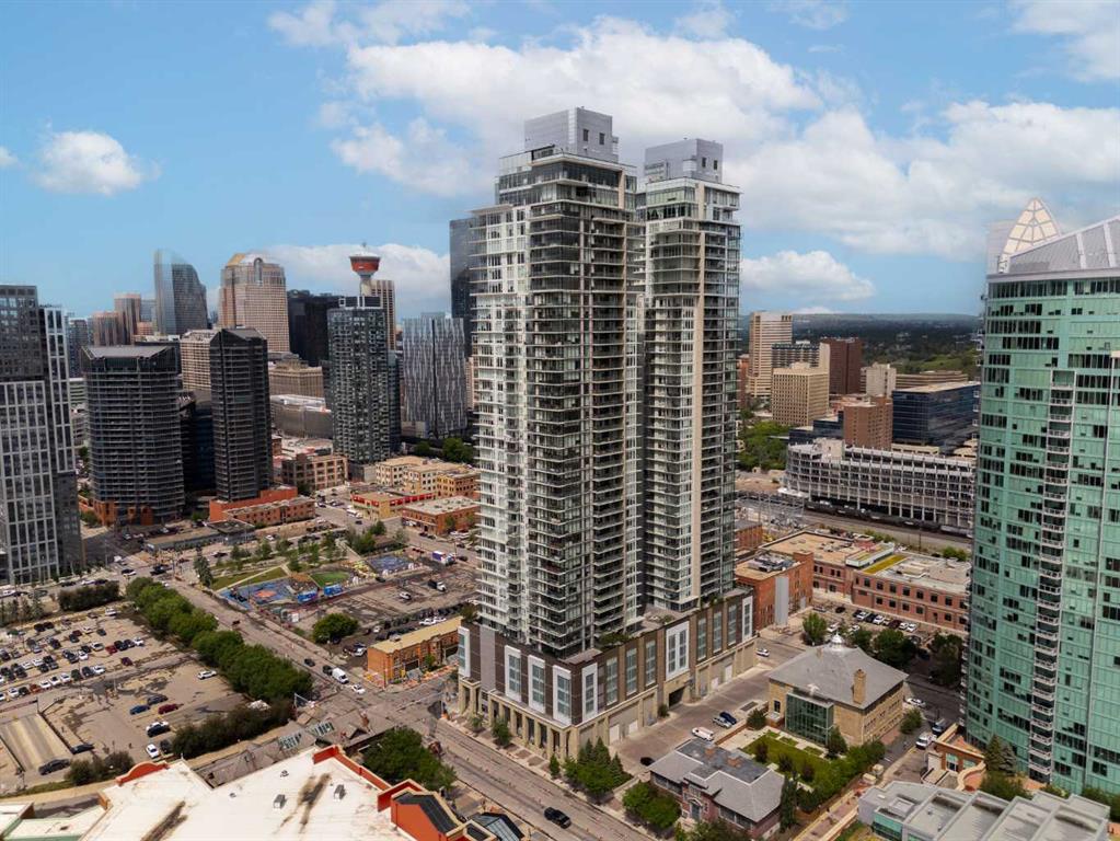 Welcome to this spectacular 2-bedroom, 2-bathroom residence perched on the 31st floor of the prestigious Guardian South Tower. Offering one of the most impressive vantage points in the building, this sky-high home features sweeping, uninterrupted views of the Stampede Grounds, Saddledome, the new BMO Centre, Elbow River, downtown skyline, and Calgary’s future entertainment district. From breathtaking sunrises to the glow of Stampede fireworks, the panorama from this elevation is truly unmatched. Designed to maximize light and livability, the open-concept floor plan is wrapped in floor-to-ceiling windows, creating a bright and airy atmosphere throughout. The modern kitchen features sleek cabinetry, integrated appliances, and quartz countertops, flowing seamlessly into the living and dining areas — perfect for hosting or unwinding with the cityscape as your backdrop. The primary bedroom offers its own private retreat with an ensuite and ample storage, while the second bedroom is ideal for guests, extended family, or a dedicated office. Thoughtful separation between the bedrooms enhances privacy and functionality. A private balcony allows you to take full advantage of the 31st-floor views. Residents enjoy exclusive access to premium building amenities, including a fully equipped fitness centre, resident lounge, workshop, and professional concierge service. A titled underground parking stall is included for your convenience. Set in one of Calgary’s most exciting districts, you are steps from the Central Library, Studio Bell, East Village, Inglewood, Stampede Park, new event facilities, cafés, transit, the river pathways, and the downtown core. This is urban living at its very best. Whether you are seeking a luxurious inner-city home or a strong investment with excellent rental potential — including corporate stays or short-term rental opportunities — this residence delivers unmatched views, refined finishes, and an unbeatable location.