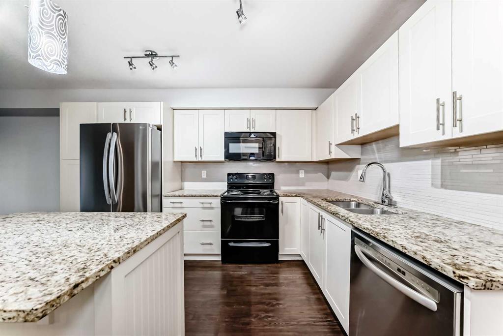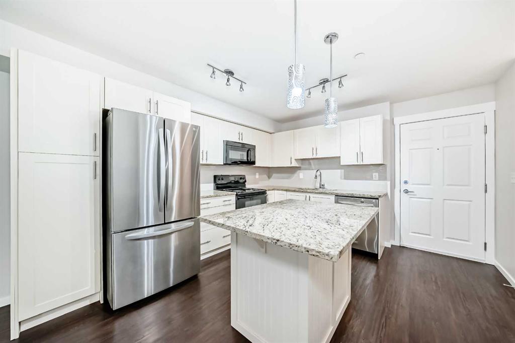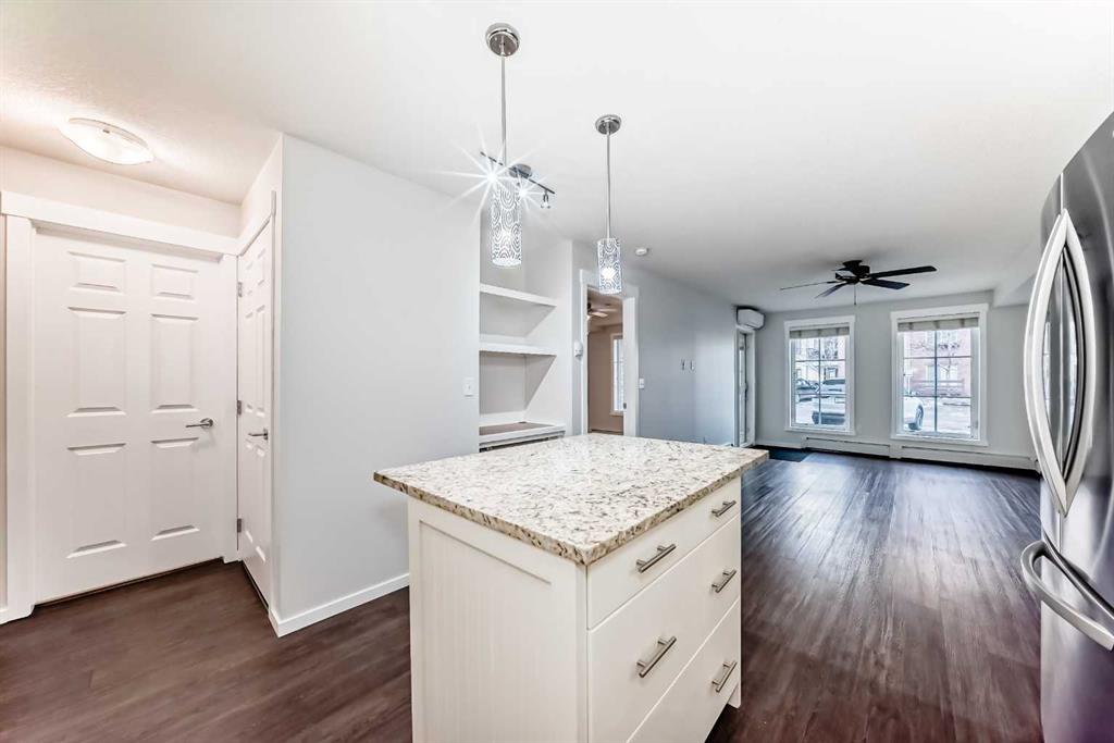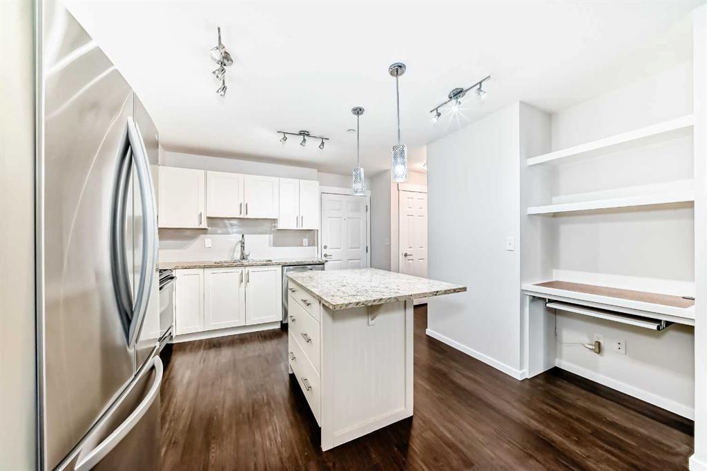 OPEN HOUSE on Sunday Jan 25th from 12-3 PM! Welcome to this meticulously maintained ground floor unit! This one has it all! Fresh paint throughout, upgraded lights, granite countertops, kitchen island with room for 3 stools, upgraded fridge and dishwasher, plenty of cabinet and counter space as well as tiled backsplash and a pantry closet! As you make your way into the living areas you have a huge living room with an access door out to the private patio area that has a gas hook up for your BBQ and there is also a desk area next to the kitchen that’s perfect for a work from home professional! The bedroom is a good size and has a walk through closet with built ins that connects to the full bathroom. If that wasn’t enough there is a doggie “potty station”, fire pit for the residents, TITLED parking, Central A/C, separate storage down in the parkade area and this unit is close to all of the areas amenities, parks, playgrounds, major roadways, 130th shopping centre, The South Health Campus, the YMCA, off leash dog parks and so much more! This one is priced to sell and just awaiting a new owner to love it!