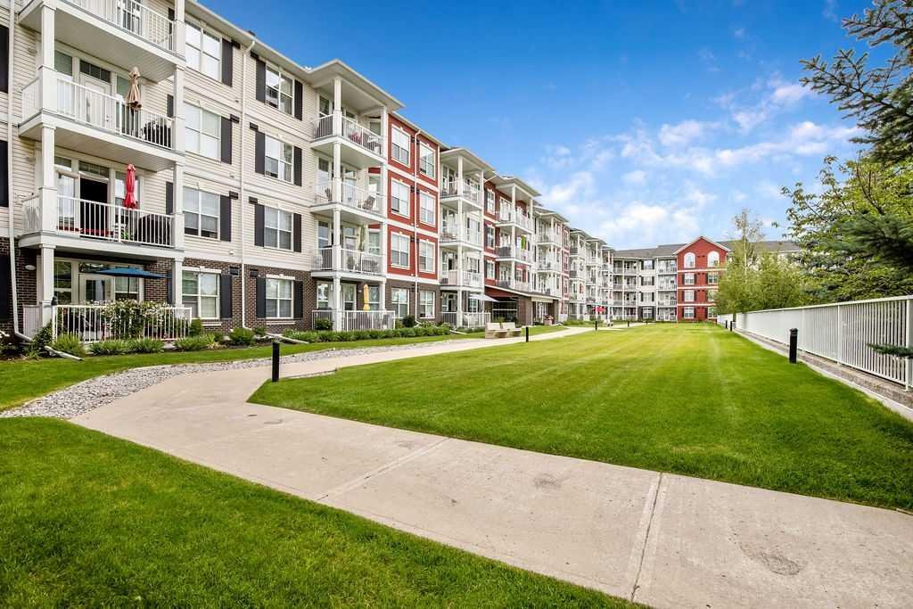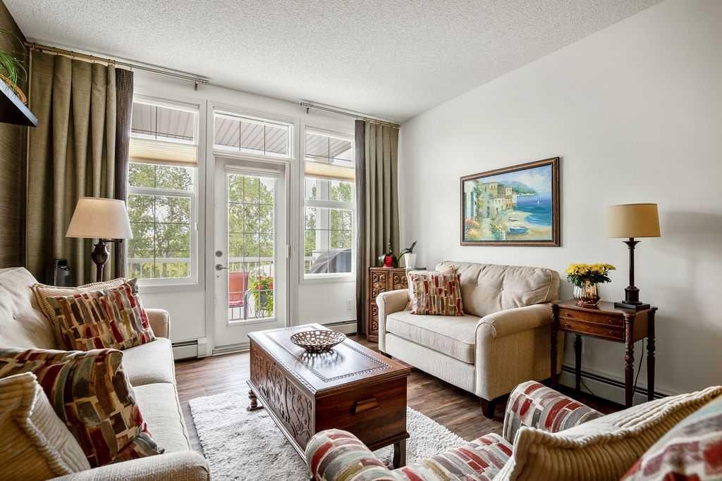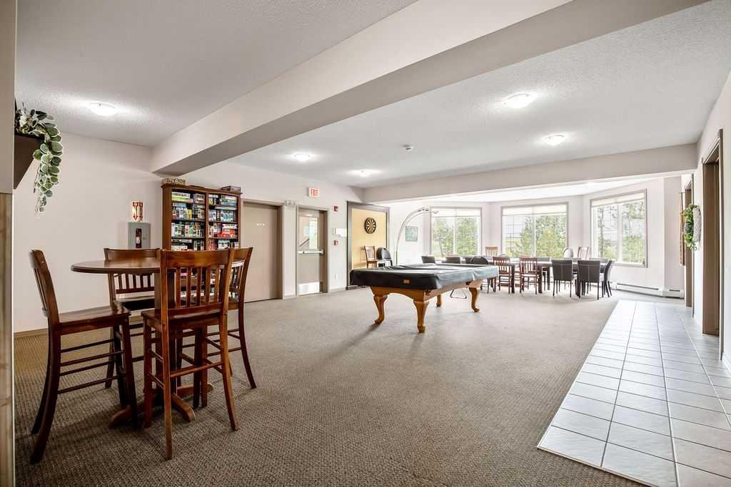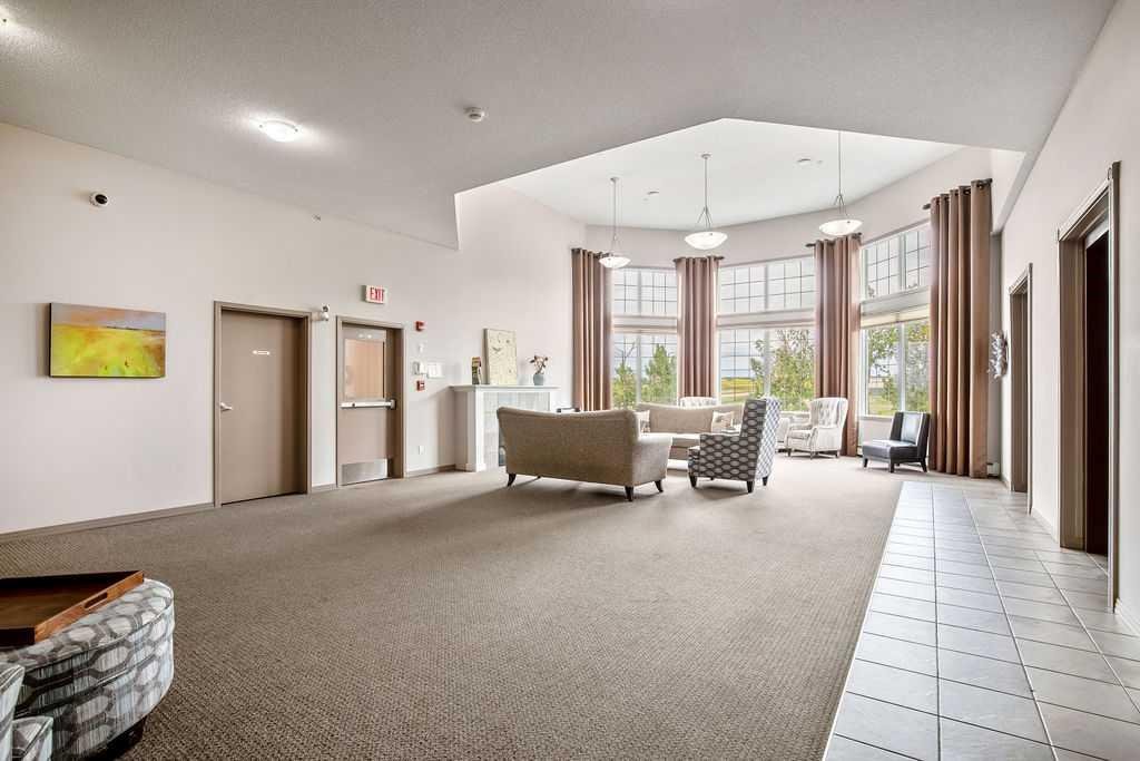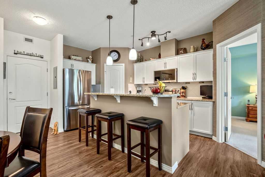 This is a lovely, immaculately maintained, 2 bedroom, 2 bath condo in the attractive Penncross condo building which is located next door to the Crystal Green Golf Course in the north side of Okotoks, convenient to all of Okotoks services, facilities & conveniences. The condo has lots of light filled rooms, a spacious feel with 9’ ceilings, easy care luxury vinyl plank in the main great room, all the stainless steel kitchen appliances have been upgraded in the last year inviting cooks to enjoy the modern kitchen, while providing plenty of storage for your cooking needs. The master bedroom has a large walk through closet area and a private 3 piece ensuite. The second bedroom is currently used as a cozy den/office area with walk through storage to the 4 piece bath and laundry area. The balcony is a welcoming outdoor space to spend leisure time with a gas BBQ hook up in place. There is one underground titled, heated parking space with storage in front and 1 assigned parking stall above ground. The building features amenities of a welcoming foyer with comfortable seating, themed areas off the elevators – a putting green, library, sitting and games area to enjoy, as well as a large fitness room that leads to the fully landscaped, south facing courtyard. Living here also facilitates access to Crystal Shores Lake with beach house & lake access for additional activities (Lake HOA fees are included in the monthly condo fee). When you enter the front door you will appreciate the secure, quiet ambiance. This may be the one for you!