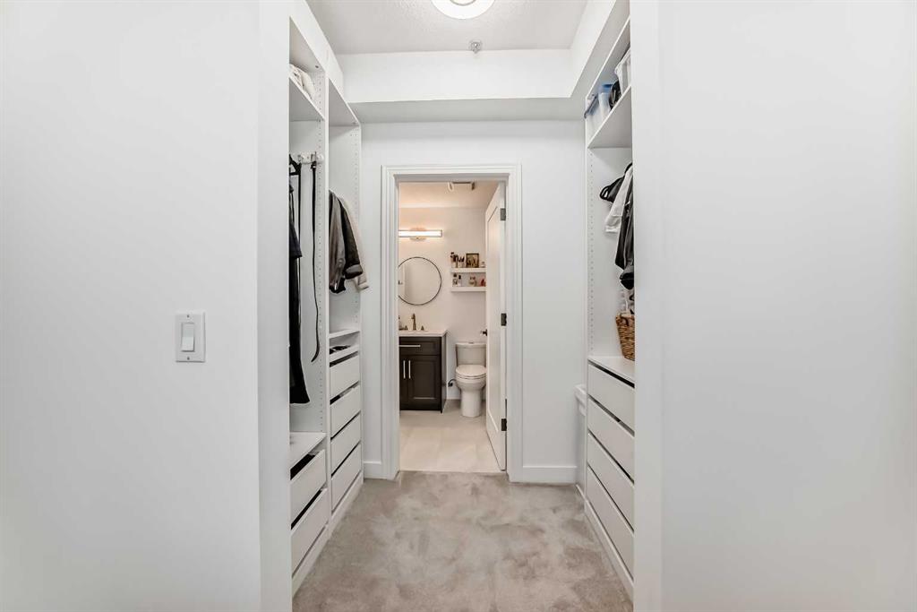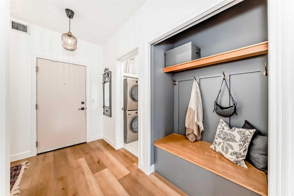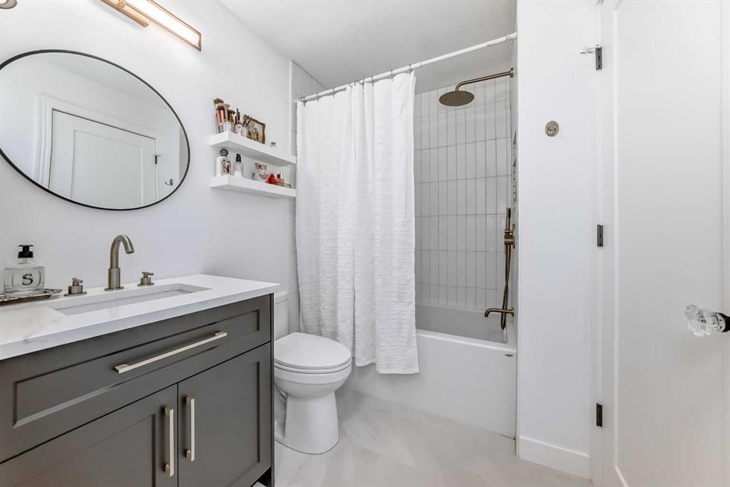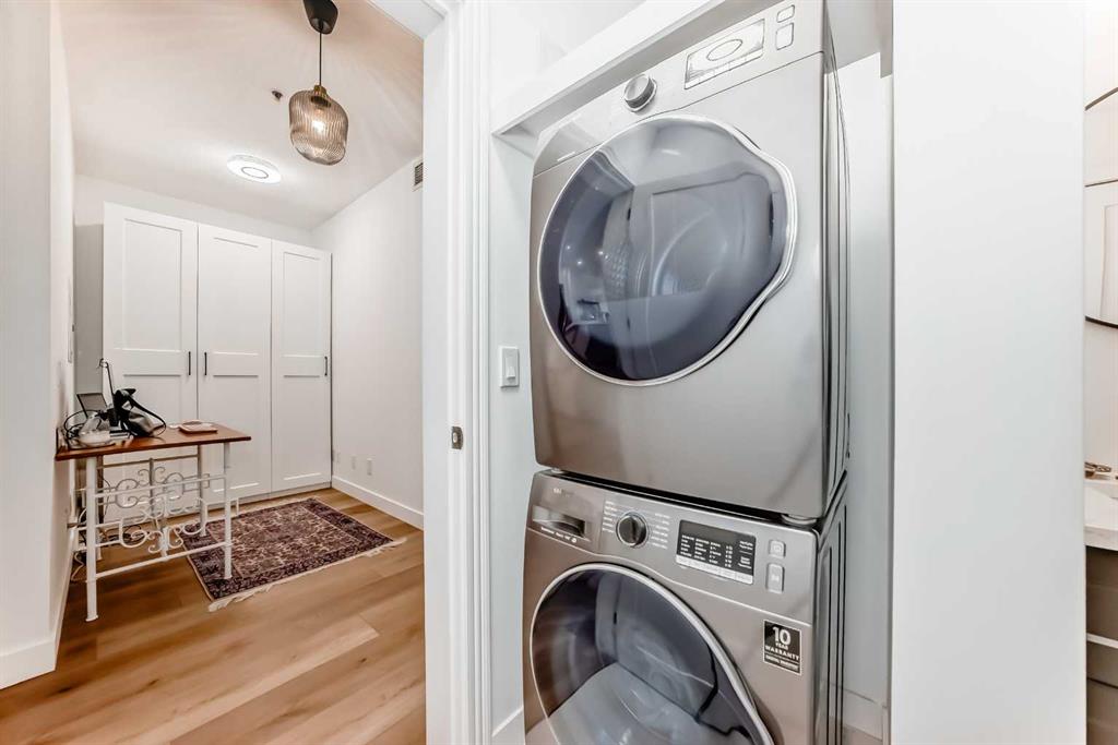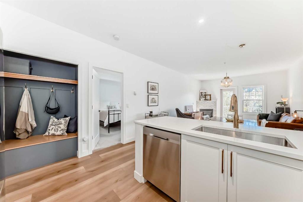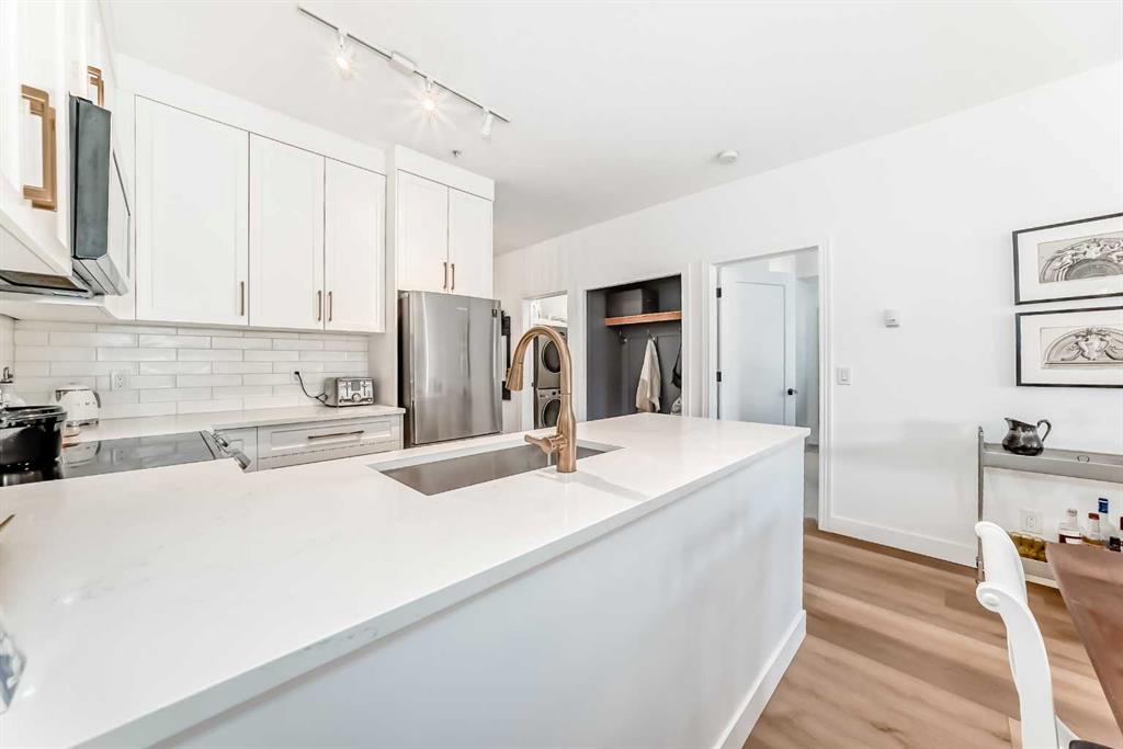 Welcome to Pearce Gardens and this beautifully renovated south facing one bedroom plus den condo in the trendy community of Inglewood. This home was completed renovated three years ago and has been immaculately maintained since. As you enter the unit you are greeted by a spacious entrance with 9′ ceilings, a conveniently located den and a wall of cabinetry for plenty of extra storage. The new custom kitchen features ceiling height sleek white shaker cabinetry, quartz countertops, stainless steel appliances and beautiful bronze hardware and faucet. The ample size dining area flows into the spacious sunny large living room which offers a gas burning fireplace and a door to access the south facing patio with bbq gas hookup. The spacious bright bedroom offers new carpet, a large window, and a walk through closet with custom closet organization on both sides to maximize your storage. The bathroom has been completed renovated with new tub, shower tile, floor tile, toilet, custom cabinetry, faucets and lighting. The unit is complete with in-suite laundry with a full size stacked washer and dryer. Renovations to this unit include vinyl plank flooring throughout, new doors, new baseboard, new lighting and all painted in a fresh crisp white. This unit includes one titled parking space in the underground heated parkade and a secure storage locker. The complex is professionally managed and includes access to a fitness centre and a large party room with a prep kitchen and outdoor patio and garden area. Enjoy inner-city living surrounded by mature trees, minutes walk to the river pathways offering easy access to downtown, walkability to trendy Inglewood’s shops, restaurants, venues, breweries and more. Living in Inglewood offers great access to all major transportation routes, Inglewood bird sanctuary and river pathways.
