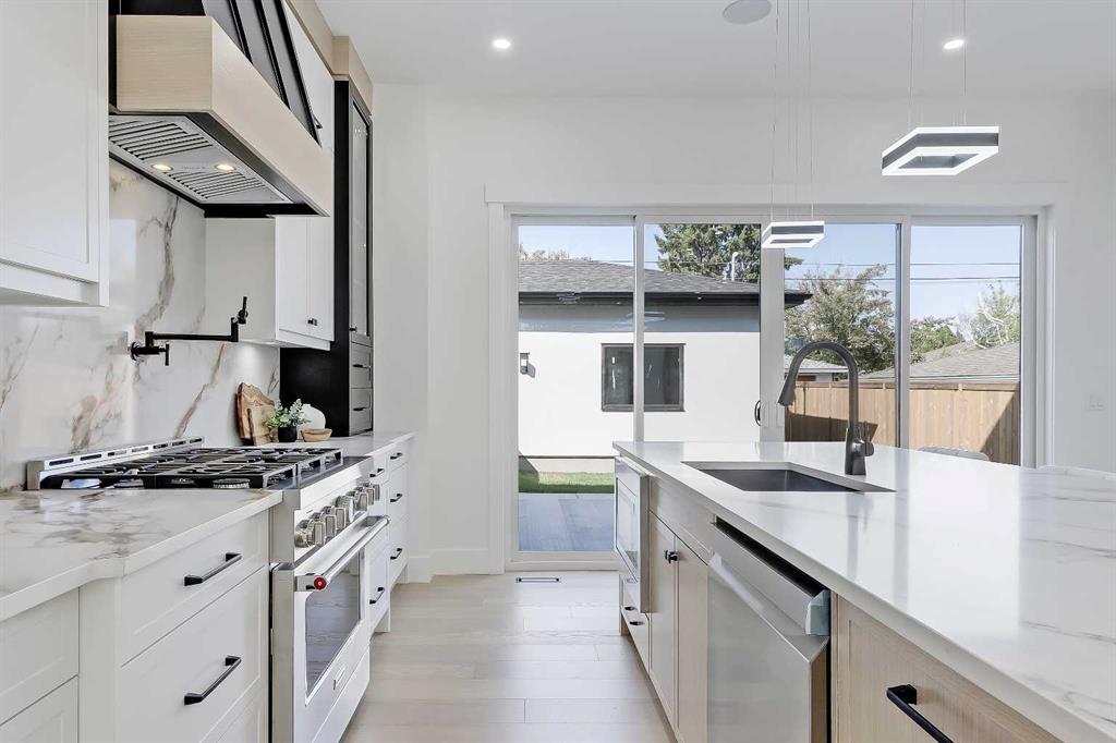 Tucked into the heart of SHAGANAPPI, this brand new 5-BED, SEMI-DETACHED home w/ LEGAL 2-BED SUITE (City approved) blends modern luxury with everyday comfort. Step through the arched entry to a welcoming foyer w/ walk-in coat closet, plus a stylish front OFFICE framed by glass doors, built-in desk & cabinetry—ideal for work-from-home. Wide-plank hardwood flows into the open-concept main floor, designed for living and entertaining. The living room centers on a sleek gas fireplace wall w/ designer tile surround and custom built-ins w/ inset lighting. At the back, the chef’s kitchen steals the show, anchored by a dedicated dining area w/ designer lighting, glass-front built-ins & in-cabinet lighting. High-end S/S appliances—gas range, custom hood fan, and DOUBLE WIDE FULL FRIDGE/FULL FREEZER, microwave & dishwasher—shine against an oversized quartz island built for gathering and stunning quartz backsplash with pot filler. A WALK-IN PANTRY w/ custom shelving adds smart storage. Bi-parting doors open to a large patio, extending the space outdoors. A chic powder room and mudroom w/ custom finishes complete this level. Upstairs, the primary suite feels like a retreat, w/ vaulted ceilings and oversized windows. The spa-inspired ensuite has it all: freestanding soaker tub, huge glass shower w/built in bench & rough in for steam, dual vanities w/ makeup desk, plus a dreamy walk-in closet. Two more bedrooms—each w/ TRAY CEILINGS with built-in lighting—share a stylish Jack & Jill bath w/ separated vanity & bath areas. The loft/study offers open shelving and flexible space for reading, working, or relaxing. A well-planned laundry room finishes this floor. The fully finished EXTENDED BASEMENT adds almost 1100sqft of additional living space. The legal 2-bed suite features quartz counters, S/S appliances, custom cabinets, private laundry, and its own side entrance w/ built-in storage. A bonus third space can connect to the suite or be locked off as a private GYM for the main home making it perfect for guests, family, or a rental incentive. Set in the vibrant Shaganappi community, this home puts Calgary’s best at your door. Golf at Shaganappi, stroll parks and pathways, or zip downtown in minutes. With great schools, trendy restaurants, boutique shopping, and easy transit nearby, this is modern city living at its best. All you have to do is move in! *Photos from show suite, finish may vary