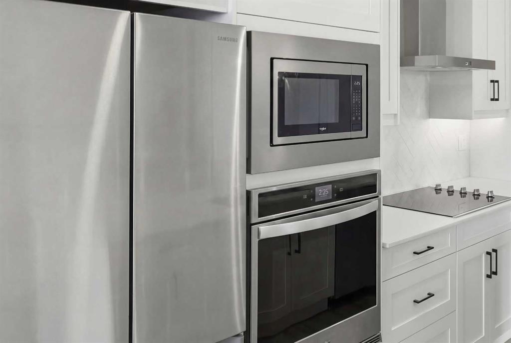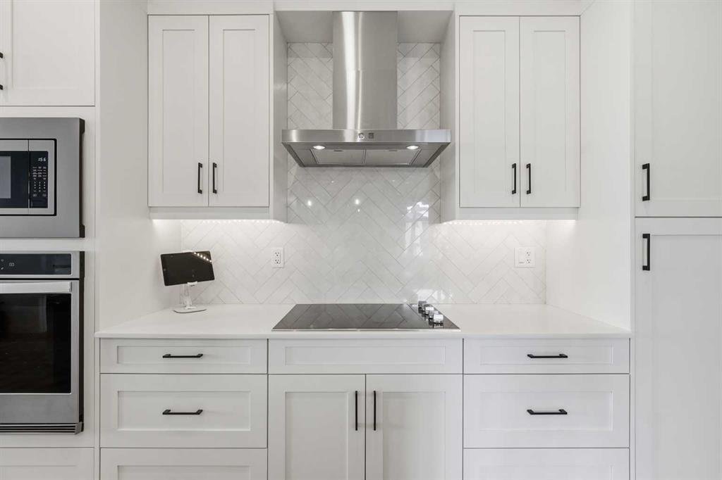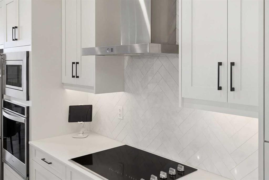 The upgraded kitchen is a true standout, featuring thicker quartz countertops, an extended island, under-cabinet lighting, and a full built-in appliance package including a cooktop, wall oven, built-in microwave, and chimney-style hood fan—creating a sleek, integrated look that perfectly complements the modern design.