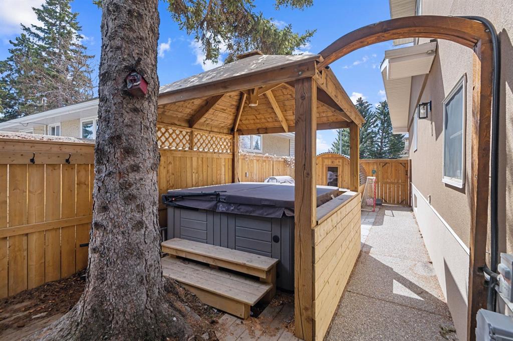 The exterior has been fully refreshed with new stucco on both the home and garage, updated doors, and a complete landscaping package. The front yard features beautifully tiered, low maintenance landscaping with mature trees, stonework, and a welcoming front approach, while the backyard is set up for relaxation with a hot tub and gazebo.