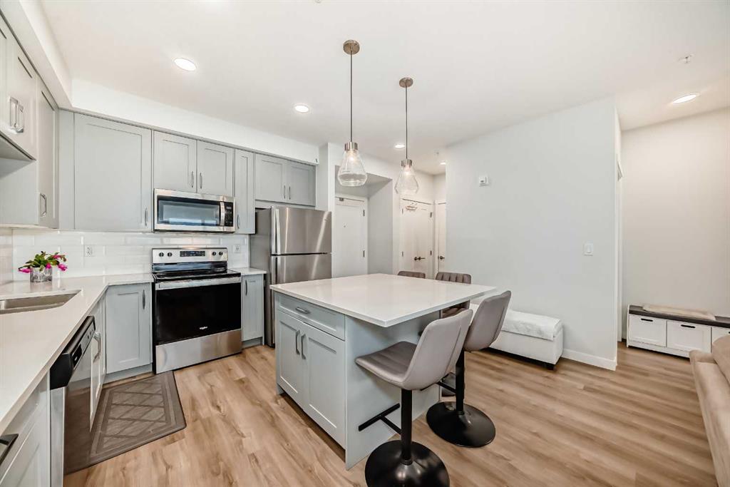 Close to Fish Creek Provincial Park, C-train station, playgrounds, St. Mary’s University, and Shawnessy Shopping Centre. Macleod Trail is easily accessible. It’s the perfect place to call home! This gorgeous 3rd floor, 2 beds, 2 bath 788 sq. ft. home, features 9′ high ceilings and an open floor plan that encompasses the living room and eat in kitchen with an island. Stainless steel appliances, granite countertops and chevron tiled backsplash make this kitchen stand out. This 3rd floor, NW facing unit has a light-coloured palette, luxury vinyl plank flooring throughout with a gas hookup for your BBQing convenience on the balcony. The primary bedroom offers a large walk-through closet and the second bedroom has a good-sized closet as well. The main bath boasts of a deep tub and tall counter and the laundry machines are full-sized. You’ll have access to a titled underground parking stall and storage unit. This is a great first home purchase or a reliable investment property. Currently tenanted until March/26 but this is negotiable. Tenant rights apply.