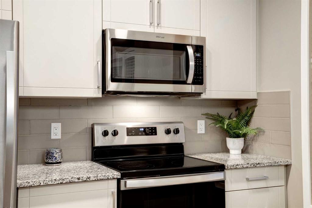 The Eat-In Kitchen is equipped w/UPGRADED SS Appliances, 1 ¼” GRANITE Counters, a Tiled Backsplash + Bright White CABINETRY w/a FULL PANTRY – delivering both style + function for everyday living or entertaining. The Living Room is WARM + INVITING, filled w/sunlight from the LARGE WINDOWS, creating the perfect place to unwind, host friends, or enjoy a quiet evening in. With its SEAMLESS CONNECTION to the dining area + kitchen and direct access to your PRIVATE SOUTH-FACING COVERED BALCONY, this space offers an ideal blend of comfort, flow + relaxation.
