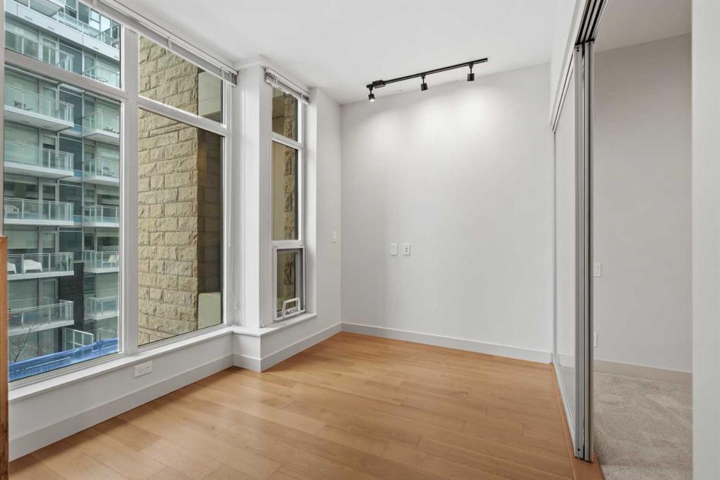 Welcome to Waterfront, one of Calgary’s most desirable downtown communities, ideally located along the Bow River and pathway system in the heart of Eau Claire. This well-maintained 1 bedroom + open den condo offers 670 sq. ft. of thoughtfully designed living space and is conveniently located on the 3rd floor. The bright and functional layout features 9-foot ceilings, a spacious open-concept living area, and a versatile den perfect for a home office. The gourmet kitchen is equipped with quartz countertops, full-height hardwood cabinetry, an undermount sink, and a gas cooktop with built-in oven, along with a dishwasher, microwave, and refrigerator. Recent updates include fresh paint and new light fixtures, giving the home a clean, modern feel. Enjoy central heating and air conditioning, in-suite laundry, and a private east-facing balcony—perfect for morning sun. The unit also includes one assigned underground parking stall and a private storage locker conveniently located just across the hall. Residents of Waterfront enjoy an exceptional range of amenities including a 7th-floor outdoor courtyard, fitness centre and yoga studio, hot tub, theatre room, guest suite, party room with pool table, bicycle storage, car wash, concierge service, secure guest parking, and 24-hour security. The building is pet friendly with board approval. Step outside and enjoy immediate access to the Bow River pathways, Prince’s Island Park, Eau Claire amenities, restaurants, shopping, and downtown, all within an easy walk. This quiet, secure building with outstanding walkability is the best of urban living.