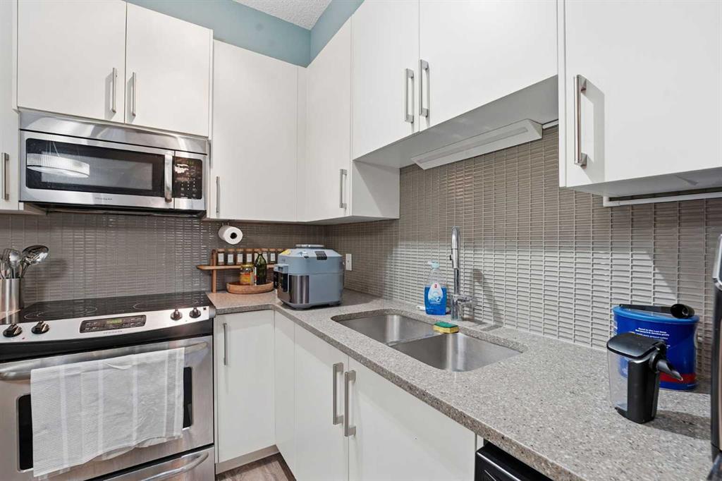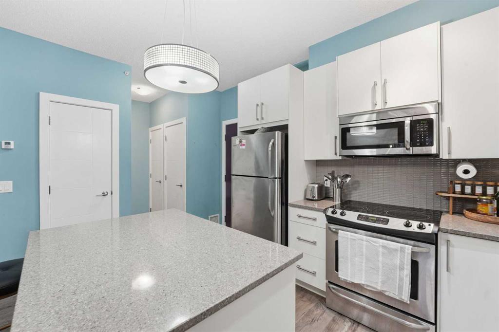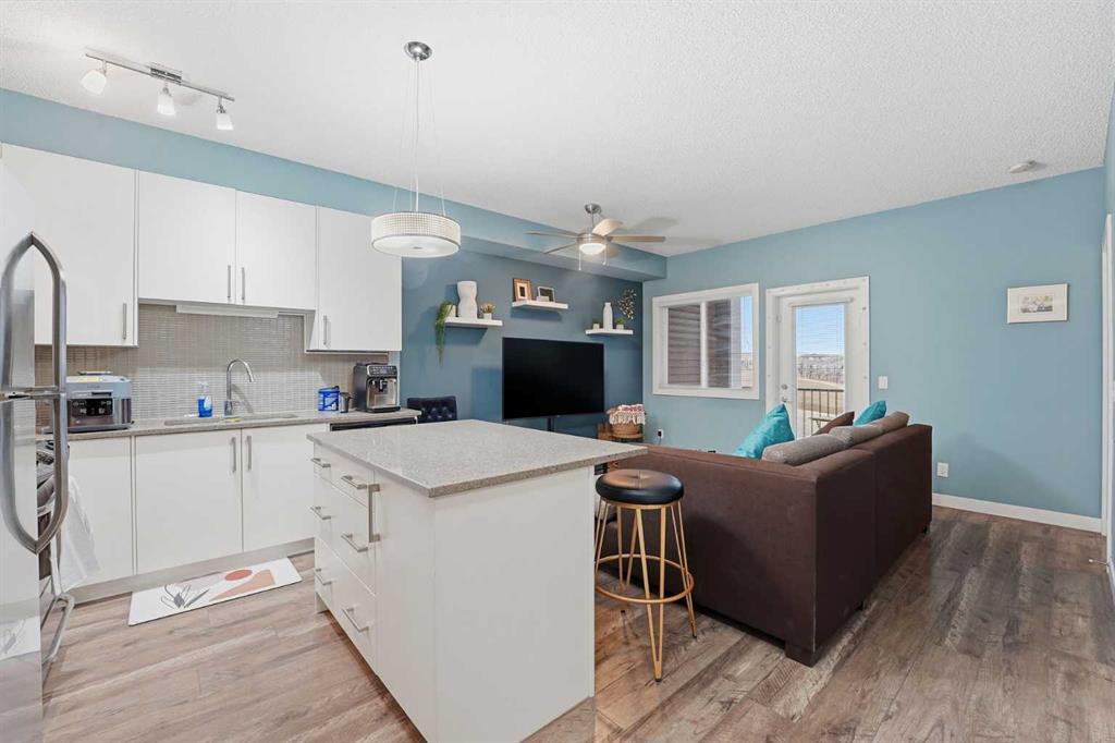 Welcome to this stunning condo situated on the inside corner of the top floor in the heart of Sage Hill. This unique placement provides exceptional privacy and tranquility, making it an ideal retreat from the hustle and bustle of everyday life. This 1-bedroom, 1.5-bathroom unit features a thoughtfully designed, open-concept layout with soaring 9-foot ceilings. The bright and airy atmosphere is enhanced by the seamless flow between living spaces, creating an inviting environment perfect for both relaxing and entertaining. The kitchen boasts white cabinetry, elegant stone countertops, and stainless-steel appliances. A massive island serves as the focal point, connecting the kitchen with the spacious living area—ideal for cooking, entertaining guests, or enjoying a morning coffee. The convenient half-bath off the living room offers easy access for visitors. The primary bedroom is generously sized, offering plenty of room for a king-sized bed and a home office setup if desired. It includes a beautiful 4-piece ensuite bathroom and a large walk-in closet, ensuring ample storage for personal belongings. Enjoy the convenience of in-suite laundry and a covered private balcony, perfect for relaxing and taking in picturesque views. The unit also includes a titled underground heated parking stall—an invaluable feature during Calgary’s colder months—and secure bike storage within the building. This apartment is ideally located just minutes away from a variety of essential amenities, like Super Walmart Centre, Costco, Pharmacies, Clinics, Restaurants, major Highways Stoney and Shaganappi, making daily life comfortable and convenient.