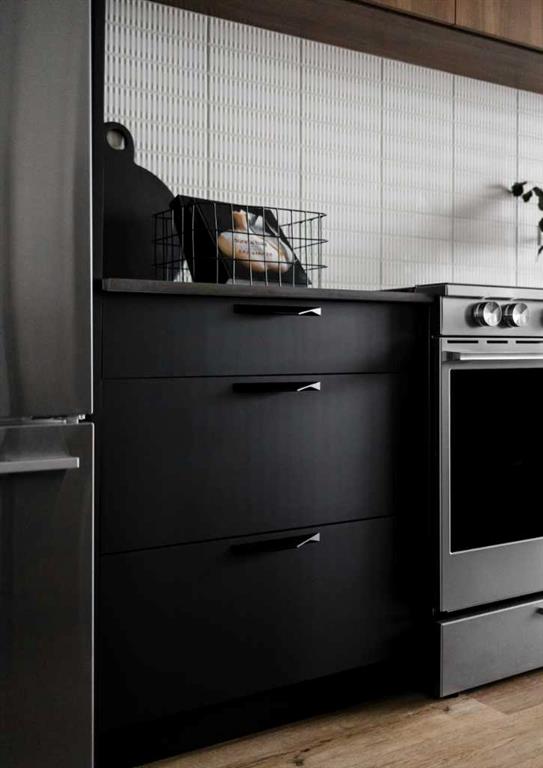 The Findlay 2 features cabinetry and quartz countertops throughout. This bright and modern unit offers 9-foot ceilings and large windows, creating an open and inviting living space. Luxury vinyl plank flooring, soft-close doors and drawers, and stainless steel appliances—including a refrigerator, smooth-top self-cleaning range, and over-the-range microwave with hood fan—are included. Quartz countertops extend into the bathrooms, and an in-suite washer and dryer complete the home.