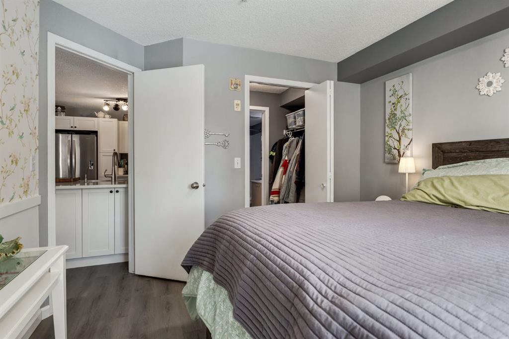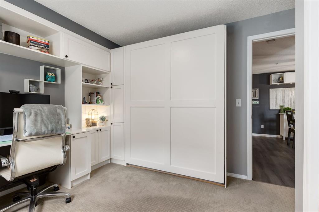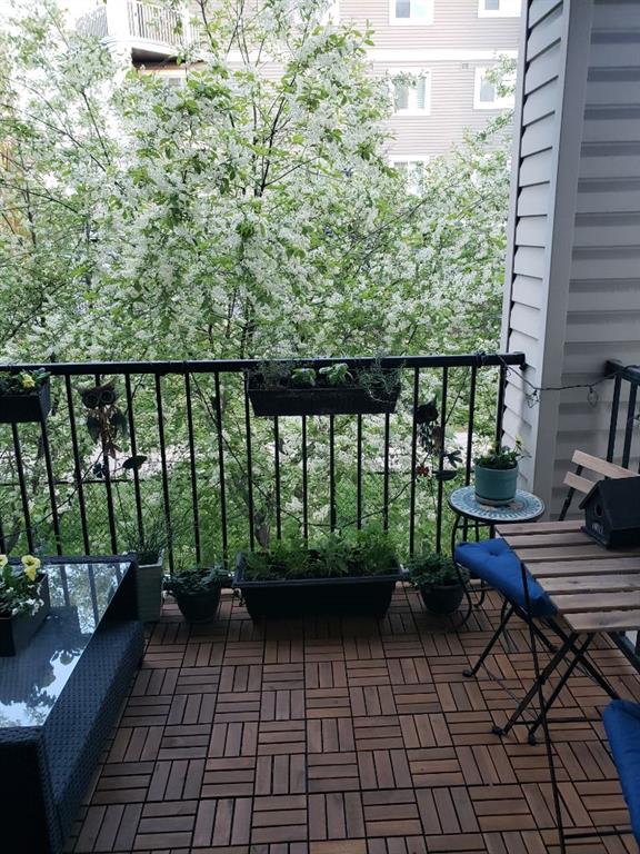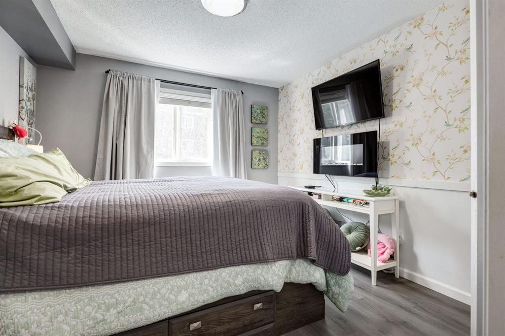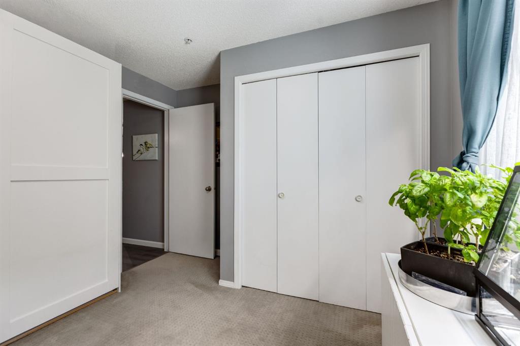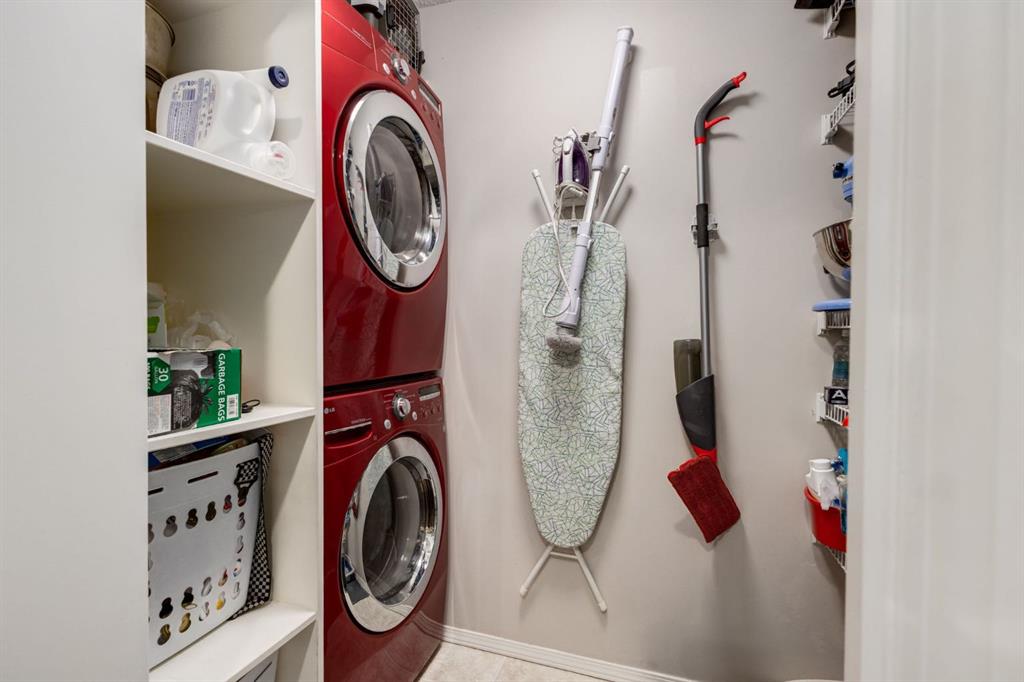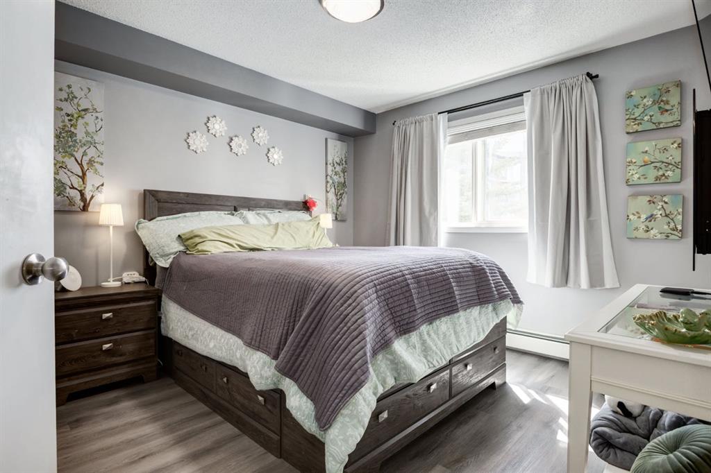 Welcome to this bright & stylish 2-bed, 2 bath condo in Mckenzie Towne that includes a titled underground parking stall & backs onto a lovely treed green space. The kitchen has been totally renovated with custom cabinets, elegant quartz countertops, an undermount sink & a stylish backsplash. You will appreciate the convenience of the pantry & spice pullouts, a Lazy Susan corner cabinet, 2-tiered utensil drawer & garbage & recycle pullout bins. Attractive stainless steel appliances include an electric stove and microwave hood fan that are only a year old. Newer premium vinyl flooring and updated lighting throughout. The roomy primary bedroom has a walk-through closet & 4-pc ensuite. The light-filled second bedroom is carpeted & enjoys the convenience of a custom Murphy bed, a built in desk, bookshelves and storage cabinets. The large in-suite storage room has plenty of room for shelving & a stacked washer (brand new) & dryer. Electricity is included! Close to schools, playgrounds, grocery stores, restaurants, the services at South Trail Crossing and transit. Easy access to 52 street, the Deerfoot & Stoney Trail. Don’t wait to book an appointment, you don’t want to miss this one!