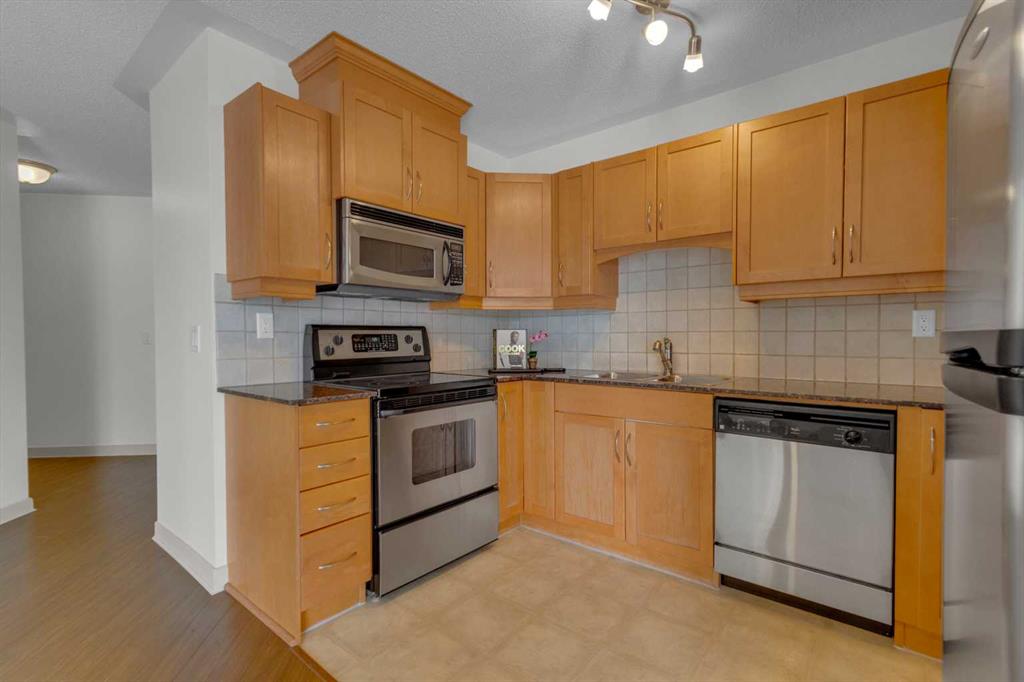 Welcome to this very clean top-floor, south-facing condo in the heart of Marda Loop, featuring fresh paint, brand new carpet, titled underground parking, and a titled storage locker. This well laid out one bedroom plus den condo is bright, welcoming and move-in ready. The open concept kitchen offers lots of cabinetry, stainless steel appliances and opens on to space for a dining table. The sun filled living room showcases beautiful views of the surrounding neighbourhood and beyond, while sliding patio doors open to a private south-facing balcony complete with a gas line for your BBQ. The bedroom has brand new carpet, a walk-through closet with shelving and access to the 4-piece cheater ensuite. The bathroom was just updated with a new bathroom fan, new light fixture and new flat painted ceiling. At the front of the condo is the flexible den space, ideal for an at home office or mudroom. In-suite laundry with lots of additional space in this room for your vacuum, linens, and anything else you wish to store in-suite. Convenient location within the building, just steps from the elevator that takes you directly to the parkade where your parking stall and storage locker are located. Enjoy living in the heart of Marda Loop in this well managed, pet friendly building with underground visitor parking, underground bike storage, third level party room with large balcony, and all the utilities included (gas, electricity, water, & sewer) in the reasonable condo fees. Just steps from Starbucks, restaurants, Safeway, banks, parks and schools. Easy access in and out of the community to Crowchild Trail and Glenmore Trail.