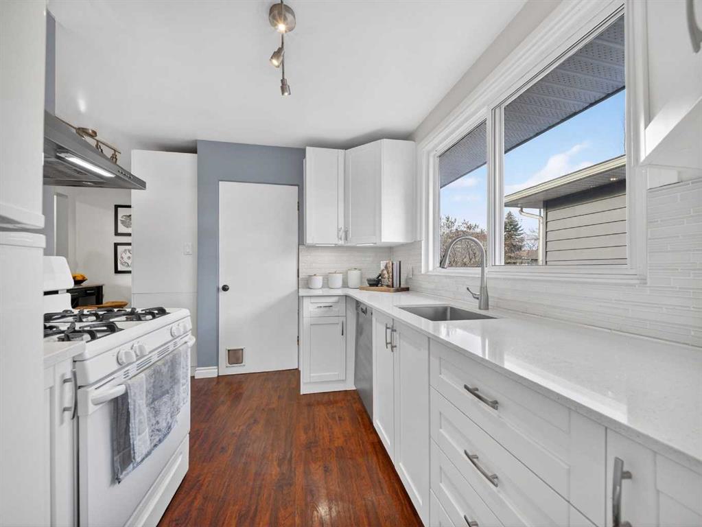The main floor features rich hardwood flooring, two spacious bedrooms plus a dedicated office, and a stylish 4-piece bathroom. The renovated kitchen is both functional and elegant, complete with quartz countertops, a gas stove, and ample cabinetry — ideal for everyday living and entertaining. A cozy wood-burning fireplace anchors the living space, adding warmth and character.
