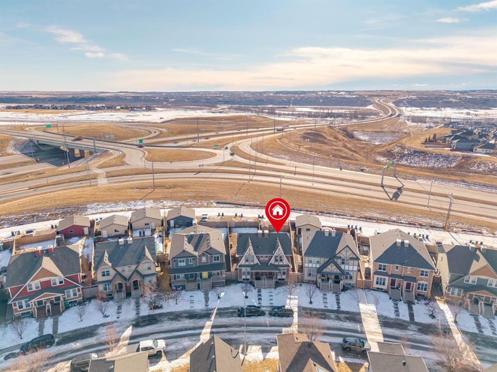 Welcome to this charming classic Tudor-style semi-detached home, perfectly situated in the highly desirable community of Cranston. Ideally positioned within walking distance to local schools and the scenic walking paths along the ridge, this property offers a seamless blend of convenience and timeless appeal. The interior reveals a highly functional open-plan living space enhanced by durable laminate flooring, leading you into a spacious living room where large windows allow natural light to flood the area. Adjacent to this, the dining area comfortably accommodates six guests without compromising on flow or space, making it perfect for intimate gatherings. The heart of the home is the well-appointed kitchen, featuring an abundance of wood cabinetry, a stylish tiled backsplash, and stainless steel appliances. The design includes a practical eat-up island with additional storage and a pantry, all while offering pleasant views of the south-facing backyard. A convenient powder room and a mudroom round out the main level, providing direct access to the outdoors. Step out onto the large private deck to entertain friends or simply relax while taking in evening views of the sun setting over the glorious Rocky Mountains. The exceptionally long yard ensures you never have to compromise on green space, even with the gravel parking pad that offers ample room for a future garage. Upstairs, the home is uniquely designed with two expansive master suites, making it an ideal layout for varied lifestyle needs. Each suite boasts its own four-piece ensuite bathroom and walk-in closet, with one room offering stunning views of the mountains. The basement houses the laundry facilities and awaits your creative touch for future development. With easy access to Stoney and Deerfoot Trails, and just moments away from the comprehensive amenities at Seton, including the YMCA and South Health Campus, this home provides an exceptional opportunity to enter a vibrant community.
