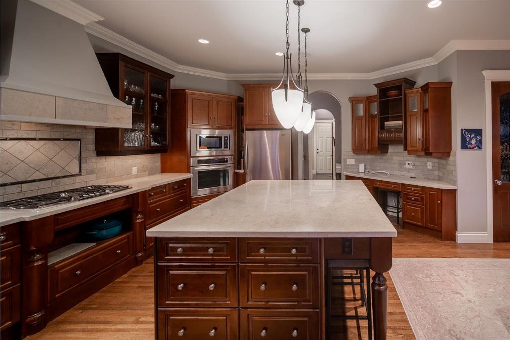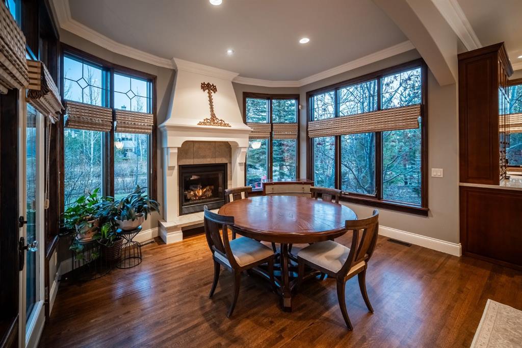 The main floor features 10’ ceilings with crown molding, quarter-sawn solid oak hardwood, and 8’ custom wood doors with upgraded hardware. A striking custom fir front door opens to a warm and inviting floor plan complete with a large office, separate dining room, and a living area showcasing a custom black walnut entertainment unit. The gourmet kitchen includes maple cabinetry, limestone counters and backsplash, stainless steel appliances, and a walk-in pantry with an additional fridge. A cozy gas fireplace warms the breakfast nook, while the covered patio offers a wood-burning fireplace with natural gas starter—perfect for year-round enjoyment. A spacious mudroom off the garage provides excellent storage.