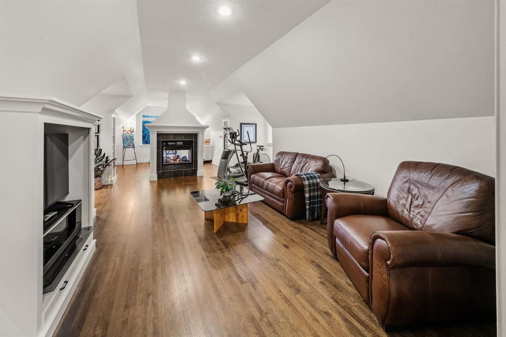The upper level continues with solid oak hardwood flooring and offers 4 bedrooms, all with walk-in closets. Three of the bedrooms feature full ensuites. A large bonus room includes a natural gas fireplace and built-in entertainment centre, along with an additional flex area ideal for an art studio, gym, or play space. The laundry room is conveniently located on this level.