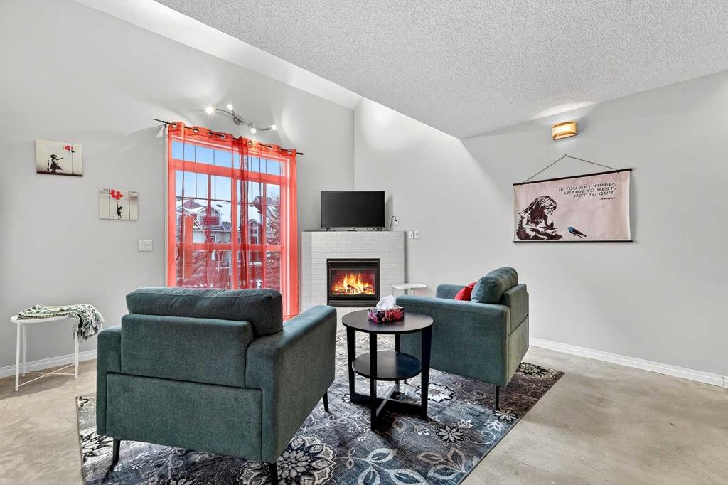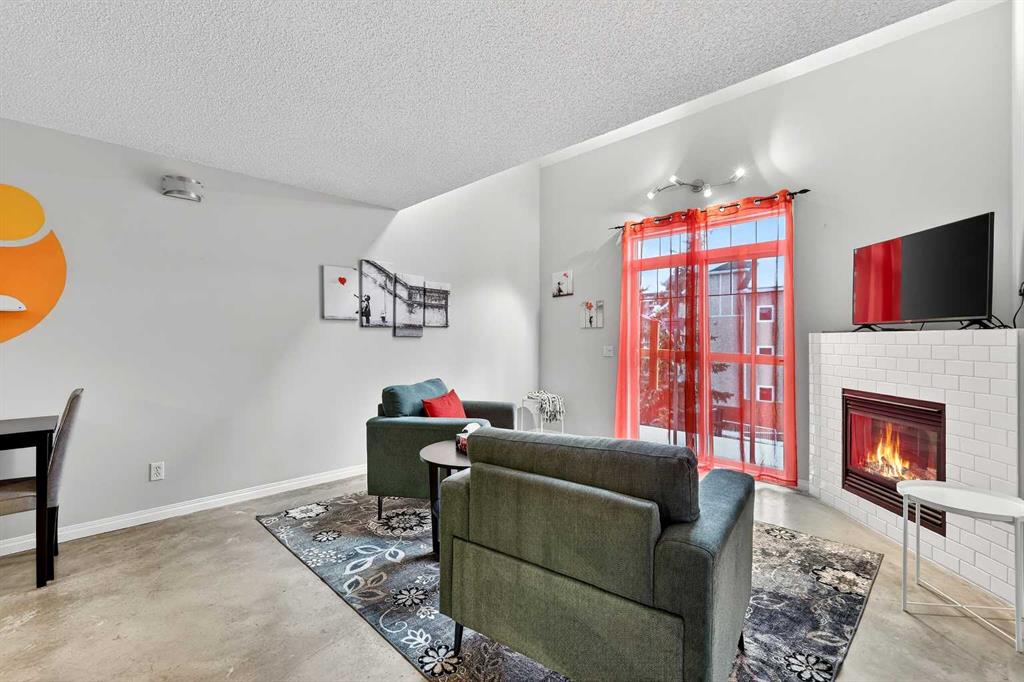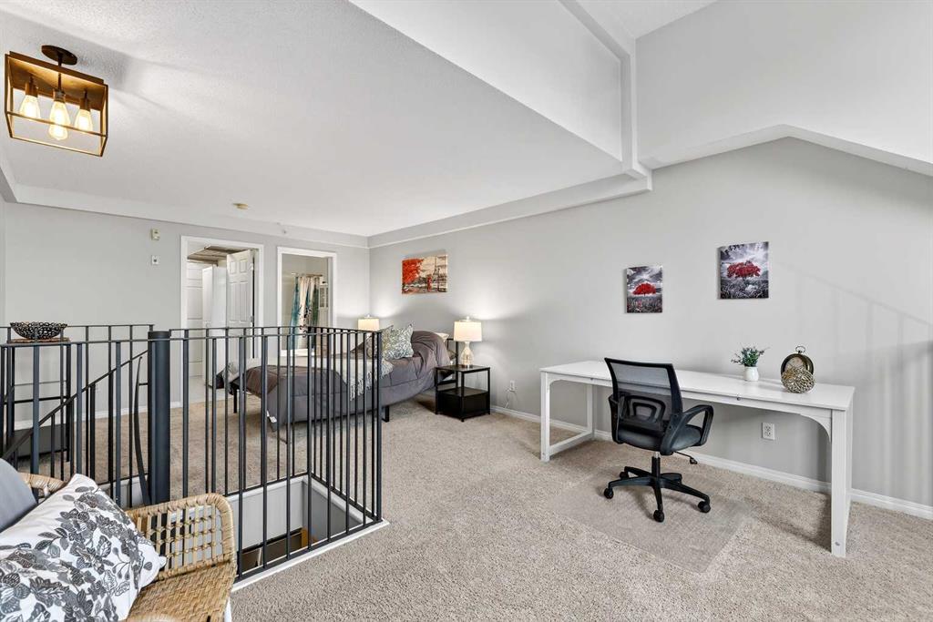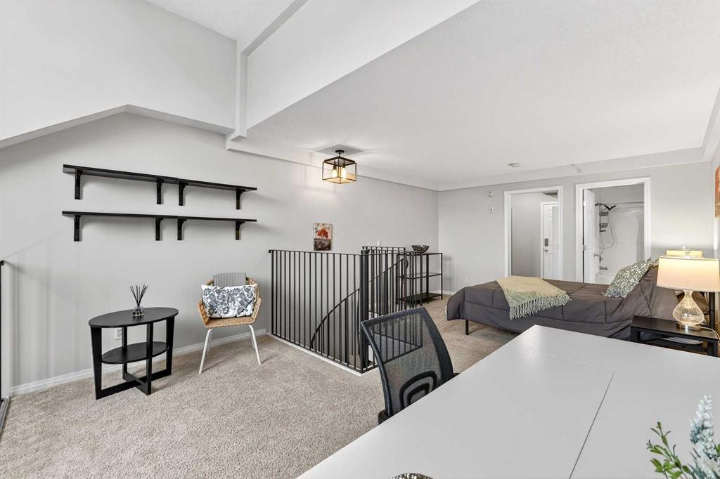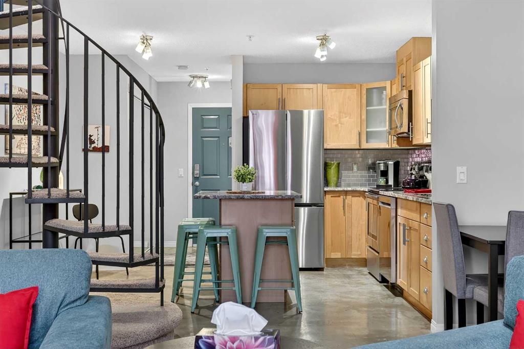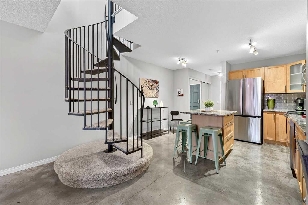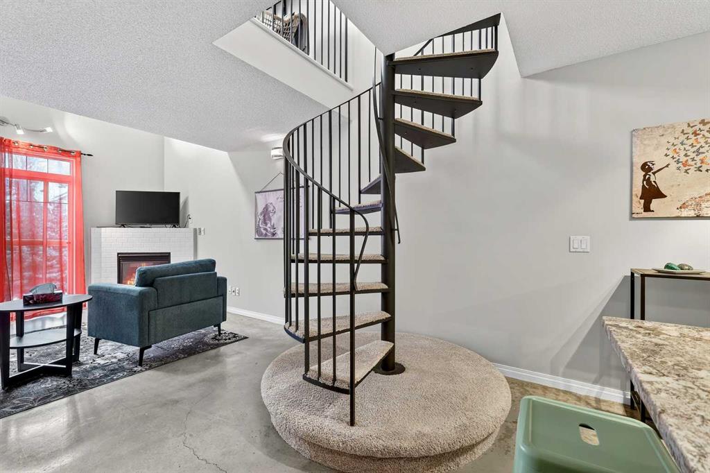 URBAN LOFT living in the heart of coveted MARDA LOOP! This rare, TOP TWO FLOORS, multi-level apartment offers LOADS of SPACE and exceptional STYLE. Step inside the main level to a spacious, OPEN floorplan complete polished concrete floors, 2-pce powder room, massive double closet in large foyer, upgraded kitchen with GRANITE counters, ISLAND with room for stools, STAINLESS STEEL appliances including NEW fridge, NEW dishwasher and maple cabinets. Living room is generous size for ENTERTAINING with corner GAS FIREPLACE for those cozy nights, and SOARING open ceiling to the second floor. Outdoor living is extended to your private balcony amongst the treetops (currently under repair). Carpeted metal SPIRAL STAIRCASE is both decorative & functional, taking you to the PRIVATE primary bedroom with FULL ceiling height! Room for KING, your retreat includes 4-piece ENSUITE, LAUNDRY ROOM with additional STORAGE, LOFT space for OFFICE/FLEX room, and secondary exit to 4th floor. No condo is complete without UNDERGROUND PARKING and this unit comes with one TITLED stall, and storage LOCKER. All this at an affordable price with the WALKABLE MARDA LOOP LIFESTYLE.