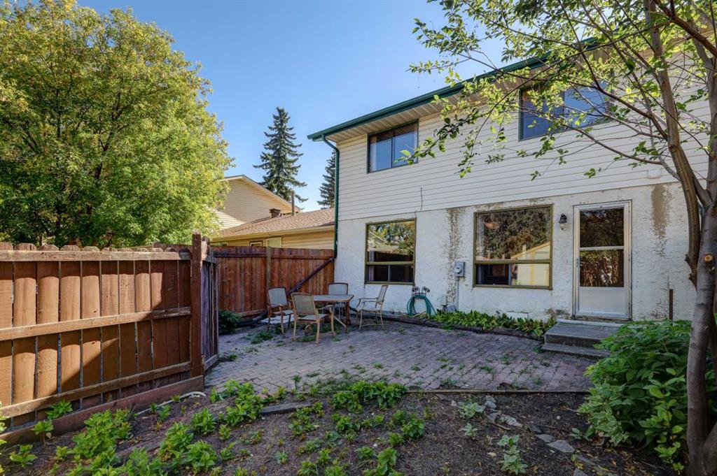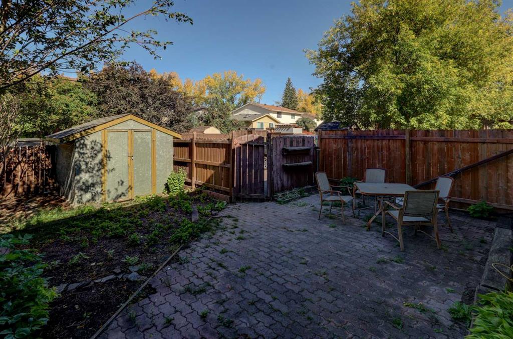 The backyard is ideal for outdoor living, with a cozy patio area, a handy storage shed, and a rear parking pad accessible from the paved back lane.