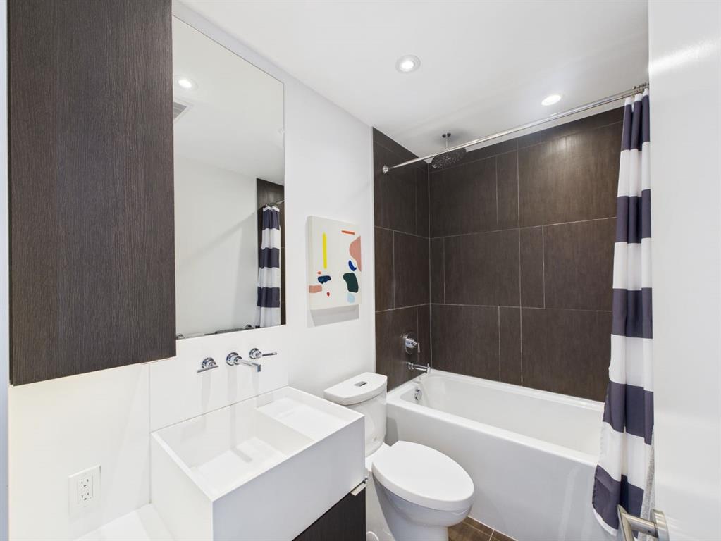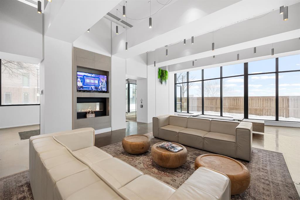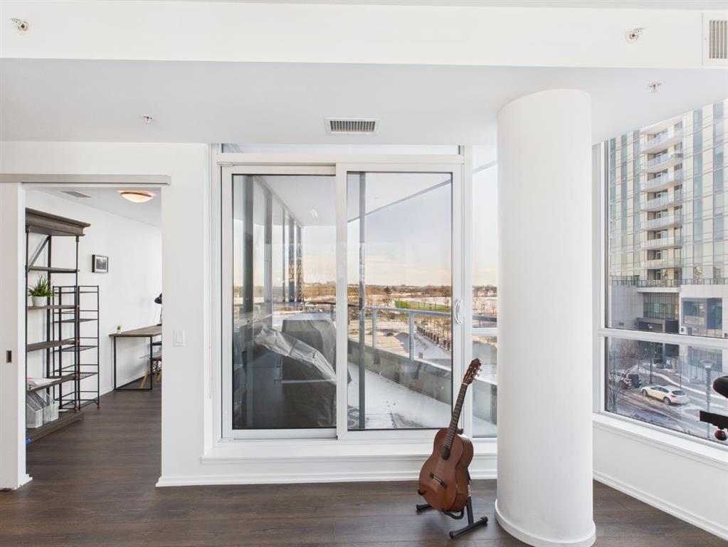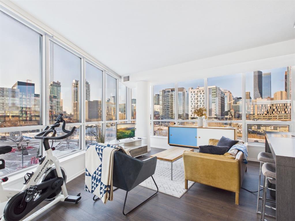 Wake up to sunlight pouring in from every angle in this third-floor 1 bedroom + den/bedroom home in the Verve, where city living meets everyday comfort. With 180-degree views stretching from the southeast all the way to the northwest, your days begin with glowing sunrises and wind down with golden evening light filtering through expansive windows. The open-concept layout is both welcoming and functional, featuring laminate flooring, quartz countertops with apple-box storage, and a modern kitchen designed for relaxed mornings and effortless entertaining. The versatile den easily functions as a second bedroom, home office, or guest retreat, adapting to your lifestyle as it evolves. Enjoy year-round comfort with air conditioning, in-suite washer and dryer, and the convenience of a storage locker and an underground titled extra-wide parking stall. Beyond your front door, the Verve offers exceptional amenities including a beautifully landscaped courtyard, a fully equipped fitness centre, and an inviting social room with cozy fireplaces. With easy access to East Village, river pathways, dining, and downtown amenities, this bright, modern home delivers the perfect blend of comfort, style, and connected urban living. Whether you are looking for inner-city living or an investment property this home is perfect!