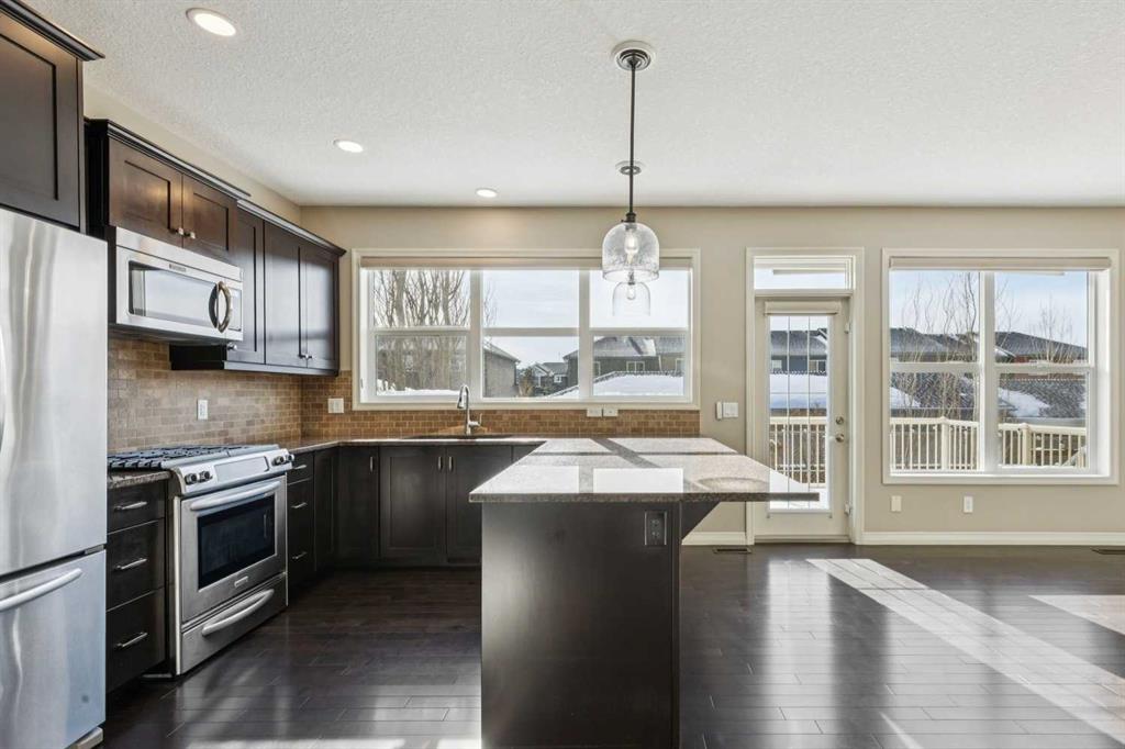Beautifully maintained & upgraded home on a choice, south exposure lot. The “Reunite” is one of Jayman’s most popular plans offering 9’ ceilings & an open plan that allows for an abundance of natural light from dawn to dusk. Spacious formal entry with 2 steps up to the comfortable great room highlighted with a brick faced fireplace with a wooden mantle. The adjoining full size dining area & gorgeous kitchen make this a wonderful space for large family gatherings & entertaining. Premium granite upgraded pull-out drawers, newer Meile dishwasher & the oversized table-top peninsula has room for 4 stools – great for serving buffet style meals. The south exposure features a large picture window overlooking the backyard. Garden door to a spacious 12’x10’ deck with a newer remote-controlled awning – perfect for BBQs & summer dinners. A convenient computer station, private ½ bath and direct access to the fully finished double garage (drywall, insulation, heat & epoxy floor) complete the main floor. The upper level offers a spacious bonus room, 4-piece bathroom, 3 bedrooms including a large primary suite with 5-piece spa-inspired ensuite, dual basins & a deep soaker tub. The convenient laundry room has been beautifully upgraded with upper cabinets, a folding table & storage closet. Many upgrades throughout the home including maple hardwood flooring on the main, LVP flooring up, lighting & plumbing fixtures. The lower level was professionally designed & finished with all required permits. The design of the large rec room allows for easy addition of a wall & door to create an optional 4th bedroom. Fully tiled 5’ step-in shower, quartz vanity countertop & electric heated flooring in the 3-piece bath. Custom wet bar, sink & refreshment fridge & room for a full-size fridge or stand-up freezer as well. Oversized storage closet with removable shelving. Large storage & mechanical room with a wash basin for crafts/hobbies. The back yard is a true oasis! Beautifully manicured & mature landscaping. A separate garden deck & a private retreat deck with portable firepit. Spacious 110’ fully enclosed area under the deck is great for seasonal furniture & storage. Enjoy the additional front & back LED lighting all year long. Over $100,000 in additional upgrades & lower-level development in the last 10 years. Wonderful curb appeal with Hardy board siding & stone front trim. Great location, one block to K-8 public school & close to walking paths & parks. Minutes to Cochrane’s popular Spray Lake Rec Centre, only 20 minutes to the Tuscany LRT or 35 minutes to YYC airport. Enjoy the views of the majestic Rocky Mountains every day on your drive home and on your weekend drives west into K-Country. Pick your possession date, move right in and enjoy! Great home! Great value!