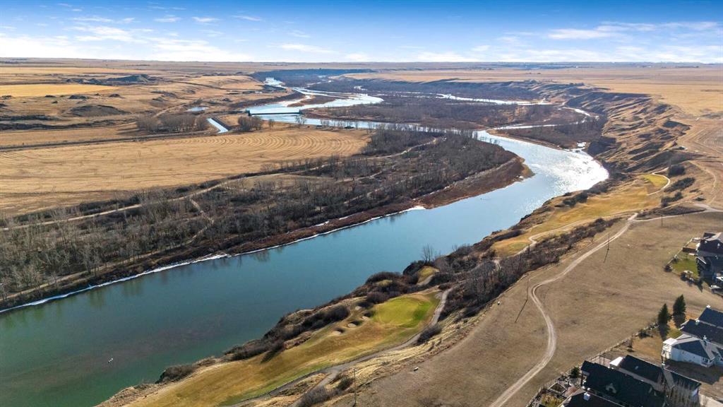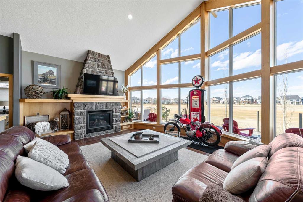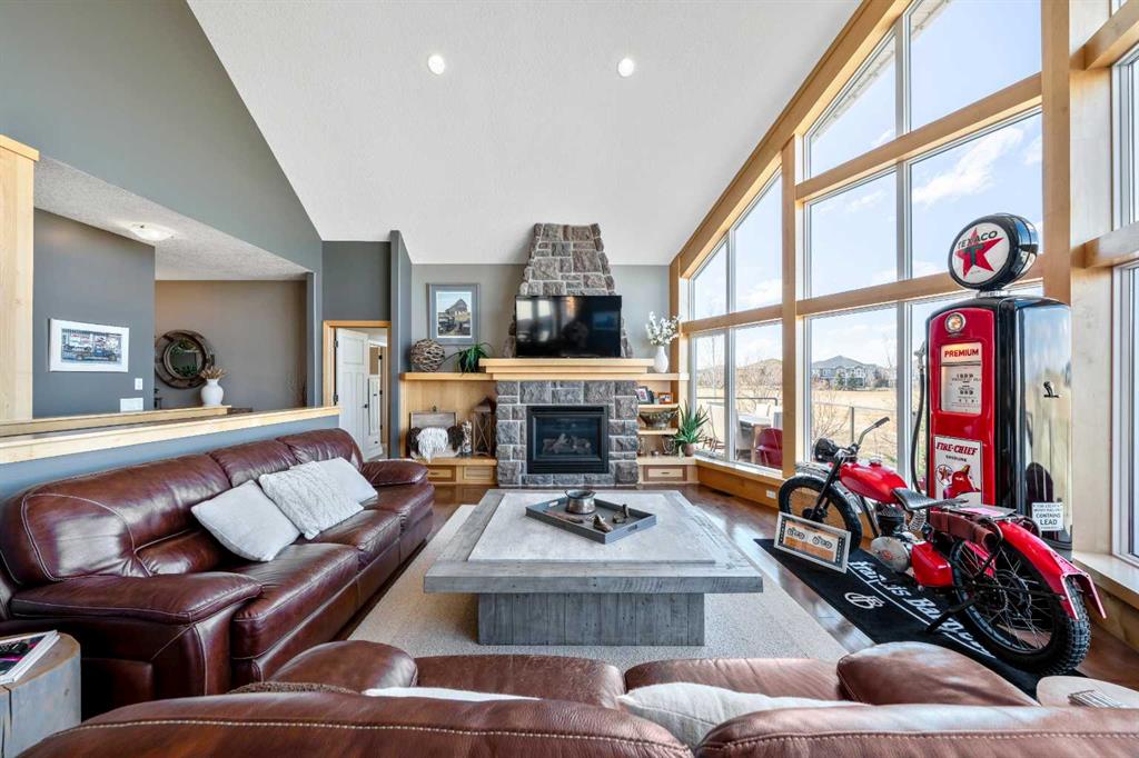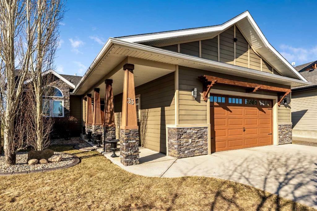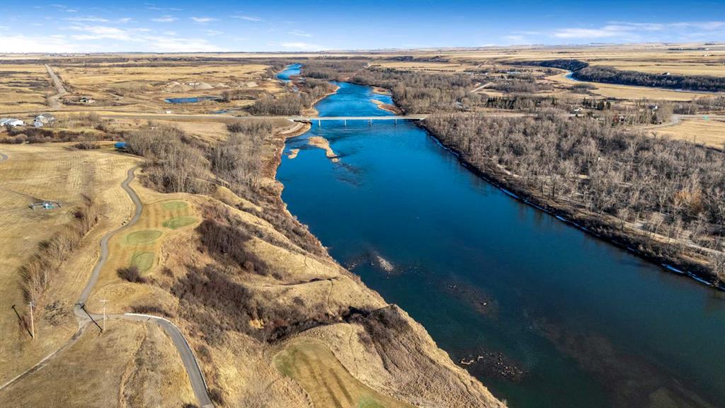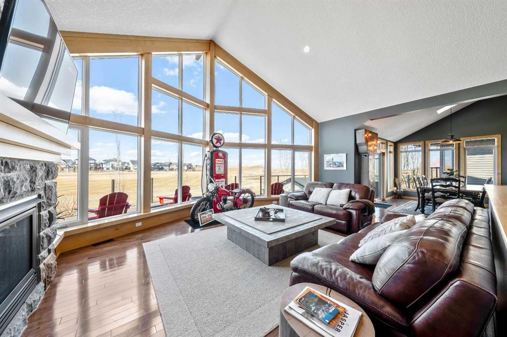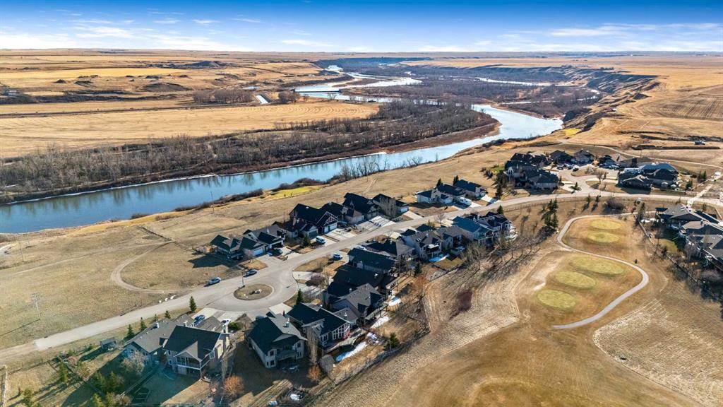 33 Wyndham Park Way Speargrass Golf Course Living! Backing the 10th fairway of the Speargrass Golf Course and just steps from the Bow River, this beautifully upgraded bungalow offers peaceful views, stunning sunsets, and over $200,000 in thoughtful upgrades… Welcome to this beautifully maintained bungalow located along the 10th fairway of the Speargrass Golf Course, offering peaceful views, stunning sunsets, and a relaxed lifestyle in one of Wheatland County’s most charming communities. Just steps from the Bow River, this home combines scenic surroundings with a bright and spacious interior designed for comfortable living. The main floor features an open-concept layout with soaring vaulted ceilings, skylights, and expansive windows that fill the home with natural light while capturing the surrounding golf course views. The impressive stone fireplace anchors the great room, creating a warm and inviting space for gathering. The kitchen is well appointed with granite countertops, a large island, and generous cabinetry, flowing seamlessly into the dining area with patio doors that open onto the upper deck—perfect for morning coffee or evening sunsets overlooking the fairway.