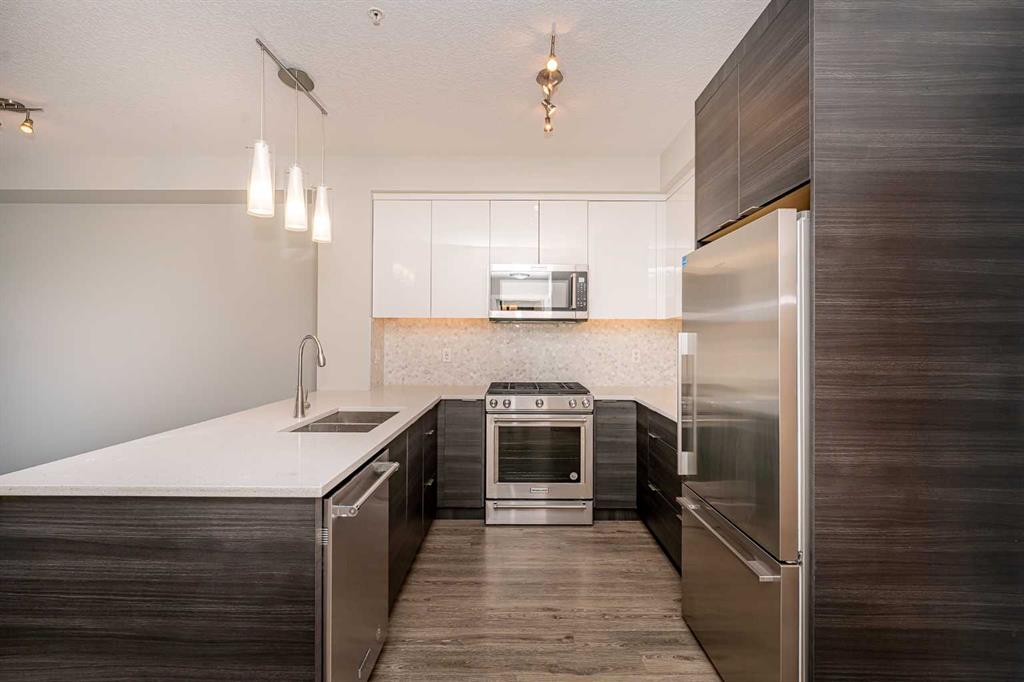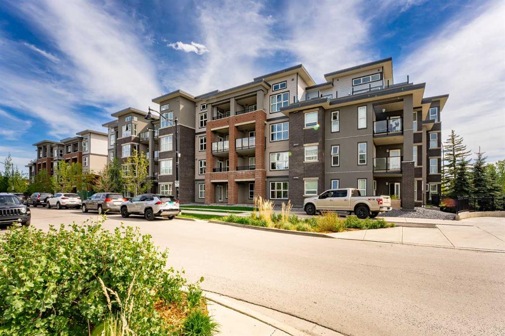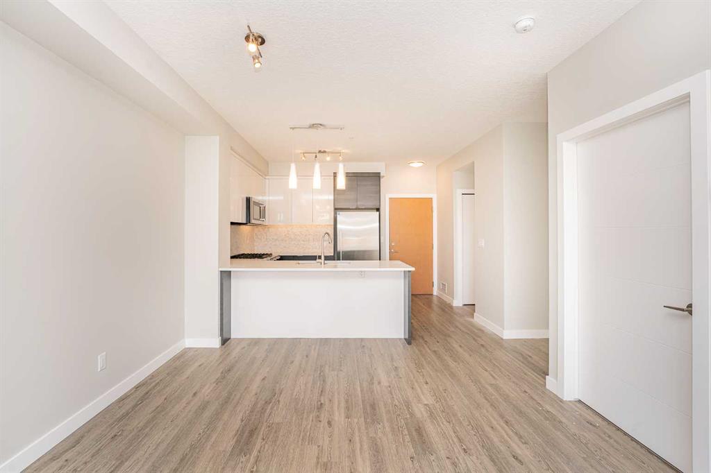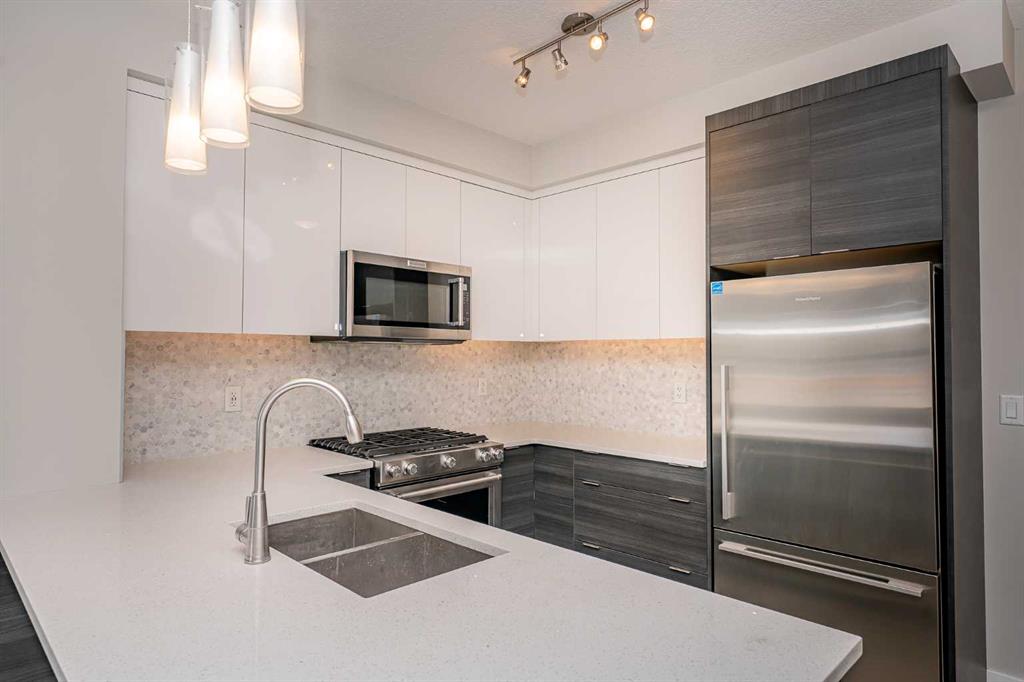 BUILDER SALE! Looking for upgrades in a spec unit? This might be the one. Welcome to the Axess building, located in the heart of the historic Currie Barracks community! This beautifully upgraded 1-bedroom unit features soaring 9-foot ceilings. Step inside to find luxury vinyl plank flooring and an abundance of natural light streaming through oversized windows. The stylish kitchen showcases a modern blend of crisp white and dark cabinetry, upgraded stainless steel appliances including a gas stove, quartz countertops, and a designer tile backsplash. An open counter connects seamlessly to the dining area, perfect for entertaining. The spacious living room leads to a top-floor balcony with a gas BBQ line and unobstructed southern views—the perfect place to relax and enjoy breathtaking sunsets. The generously sized primary bedroom features a walk-through closet with direct access to the elegant 4-piece bathroom, complete with tile flooring, quartz countertops, and a soaker tub. Just off the kitchen is a versatile nook—ideal for extra storage or a small home office setup. Additional highlights include in-suite laundry, underground parking with a car wash, and a private storage locker located directly in front of your parking stall. All this in a prime location—steps from Mount Royal University, walking paths, parks, shopping, and with easy access via Crowchild Trail to Marda Loop and downtown Calgary. A truly exceptional opportunity to own in one of Calgary’s most desirable communities.