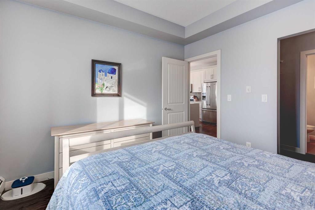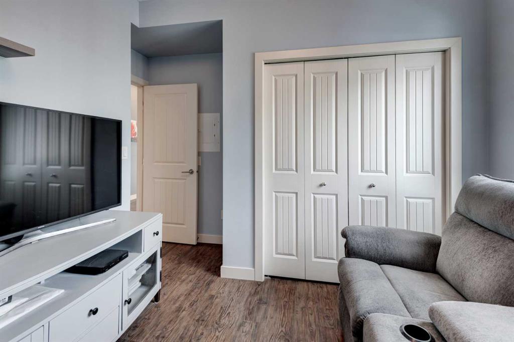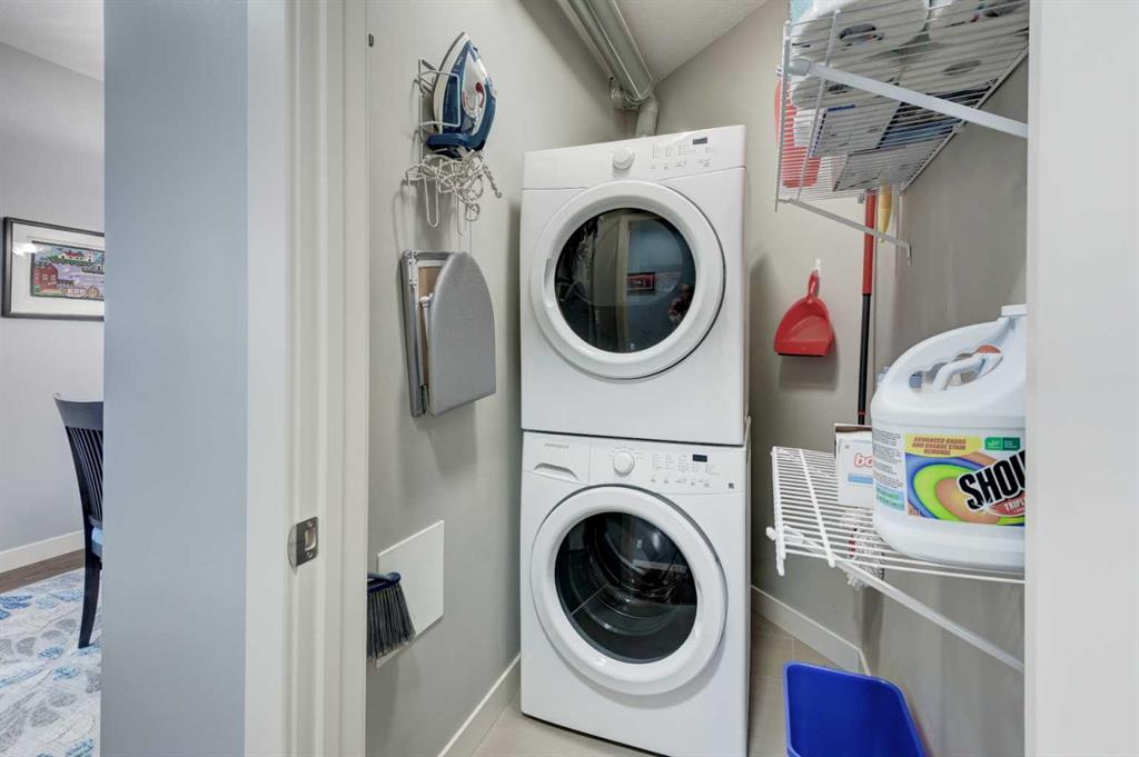 The original owners have kept this bright unit in impeccable condition. As you enter thru the front door, note the vinyl plank flooring throughout and the air conditioning to keep the unit at a comfortable temperature. The coat closet is conveniently on your right. The next door is a laundry room, and it is deep enough for additional storage. The den/flex area is currently used as a dining room. Continuing, there is a 4-piece bathroom and a second bedroom, that is currently used as a TV room. The open kitchen has quartz counters with upgraded waterfall countertops on the island. The 4 stainless steel appliances and breakfast bar stools are all included! The living room, with an electric fireplace, leads to the west facing balcony, complete with a hooked-up gas barbeque. The primary bedroom is off to the side and has a walk thru closet leading to the 3-piece bathroom with a lovely walk in shower. You won’t be disappointed in this lovely unit that has two titled parking stalls, one underground, in front of the storage unit and one outside.