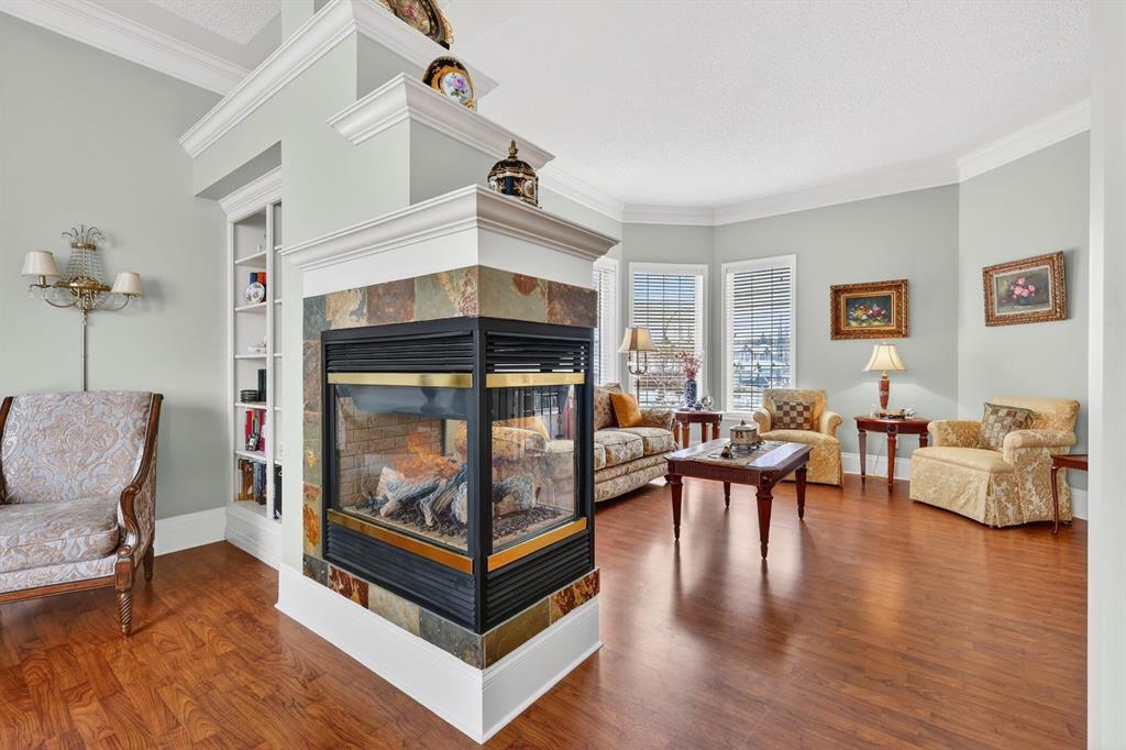 Welcome to a truly remarkable home in the heart of McKenzie Lake. Whether it’s morning walks along the ridge, bike rides through the river valley, or quick access to everyday amenities along 130th Avenue, this location blends outdoor living with everyday convenience. Positioned on a corner lot, the exterior of this home is nothing short of striking. Sweeping across the lot, the front entrance features grand pillars, exposed aggregate walkway, and architectural detailing that sets the tone for what awaits inside. You are greeted with over 3700 square feet of developed living area, a foyer framed by soaring 10 foot ceilings, elegant wrought iron railings, with a welcoming yet impressive feeling. Just off the entrance sits a beautiful home office, enclosed by glass French doors and finished with custom built in bookshelves. A few steps up, the upper level introduces the primary retreat, thoughtfully elevated to create a sense of privacy. This space features dual walk-in closets and an ensuite designed with indulgence in mind. A corner soaker tub invites relaxation, while a standalone shower, generous counter space, and a private water closet complete this bathroom. The main level unfolds with timeless architectural detail. A formal dining area framed by custom pillars and archways creates a memorable setting for hosting, while the passthrough nook offers an added touch of convenience. Look up and notice the thoughtful detailing around each ceiling light fixture, subtle craftsmanship that adds character throughout. Just beyond, a formal sitting room provides a refined yet comfortable space. This area flows into the heart of the home where a triple sided fireplace connects the living spaces for warmth and ambiance. The main living room is designed for everyday comfort, complete with a built-in entertainment centre. At the center of it all is the kitchen, a true showstopper. The expansive corner layout provides an abundance of counter space, cabinetry, and drawers. A glass cooktop and a custom hood fan that blends with the cabinetry add to the polished design. The large island serves as both a prep space, while also adding practicality with seating. Just beside it, a small dining area is wrapped in windows and overlooks the back deck and yard. Downstairs, the fully developed, walk out basement continues the home’s thoughtful design. Large windows allow natural light to pour in, making the space feel bright. A custom wood bar and another fireplace anchors the recreation area, perfect for hosting friends or relaxed evenings in. This level also includes three additional bedrooms and a spacious five-piece bathroom. The lower level mudroom offers extra storage, laundry room, a convenient laundry chute exit, and access to the garage. The secluded yard feels like a private retreat where mature trees create a peaceful backdrop that offers both shade and privacy. Homes like this rarely come available, once you step inside you’ll understand why.